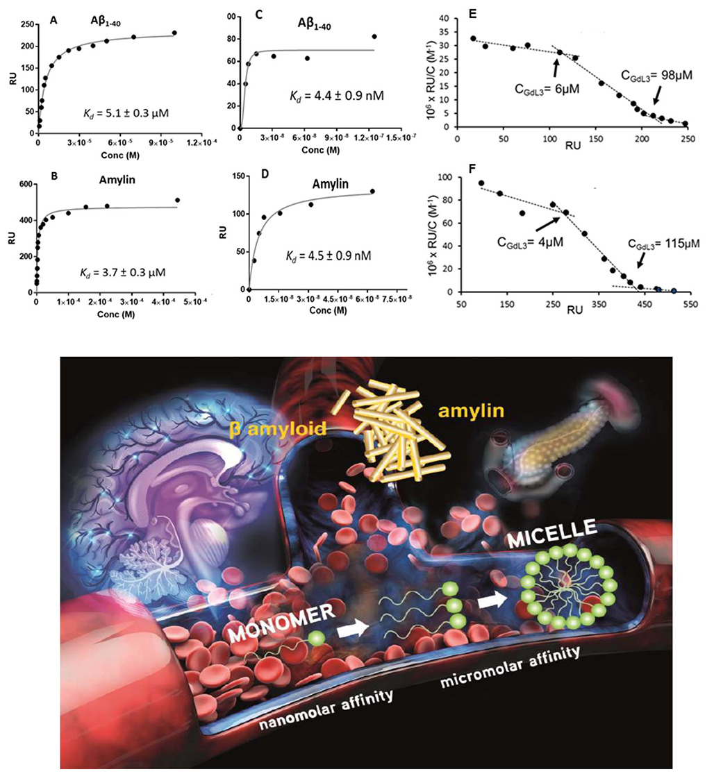 Top: SPR binding plots fitted as 1:1 Langmuir isotherm functions for the interaction of GdL6 with Aβ1–40 (A, C) and amylin (B, D). Peptide immobilization was 4000 RU (A, B) and 9000 RU (C, D). For C and D, points recorded only at low concentrations are represented. E and F are respectively the Scatchard linearization plots of A and B. Reproduced with permission from Sens. Diagn. [43]. Bottom: Sketch of the aggregation of amyloid-targeted, PiB-derivative probes and its influence on peptide binding affinities. Reproduced with permission from Chem. Eur. J. [52].