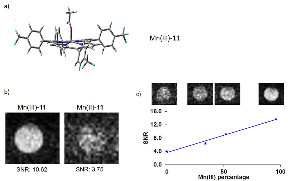 (a) Most stable structure obtained through DFT optimization at the B3LYP/6-31G(d,p) level of Mn(III)-11. (b) 19F MRI phantom images acquired at 1.1 mM Mn(III)/(II)-11 concentration in DMSO. (c) Monitoring reoxidation of Mn(II)-11 (cMnL = 1.6 mM) by air oxygen; signal-to-noise ratio (SNR; with respect to the Mn(III)-11 peak) as a function of oxidized Mn(III)-11 content (%). B: 7 T; TR: 60 ms; TE: 1.3 ms; FA: 90°; NA: 256; acquisition time: 8 min 11 s. Reproduced with permission from Ref. [75].