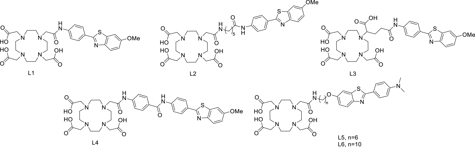 Metal-based imaging agents capable of visualizing amyloid peptides have been the focus of very intensive research for many years now, with the most attention being directed at Alzheimer’s disease by using nuclear imaging techniques [42, 43, 44]. We have been long engaged in this research via the development of potential imaging agents for Aβ and amylin. Our probes are constructed in a modular way, consisting of a macrocyclic, DOTA-type metal chelate, an amyloid recognition moiety based on the benzothiazole derivative Pittsburg compound B (PiB), and a linker between the two. The modularity allows for a better understanding and control of the role of each element in amyloid binding properties. The DOTA-type chelator makes the probes easily adaptable to various imaging modalities, as it can efficiently complex various metal ions suitable for MRI (Gd(III)), for optical detection (luminescent lanthanides), and for nuclear imaging (e.g., 111In for single-photon emission computed tomography and 68Ga for positron emission tomography [PET]).