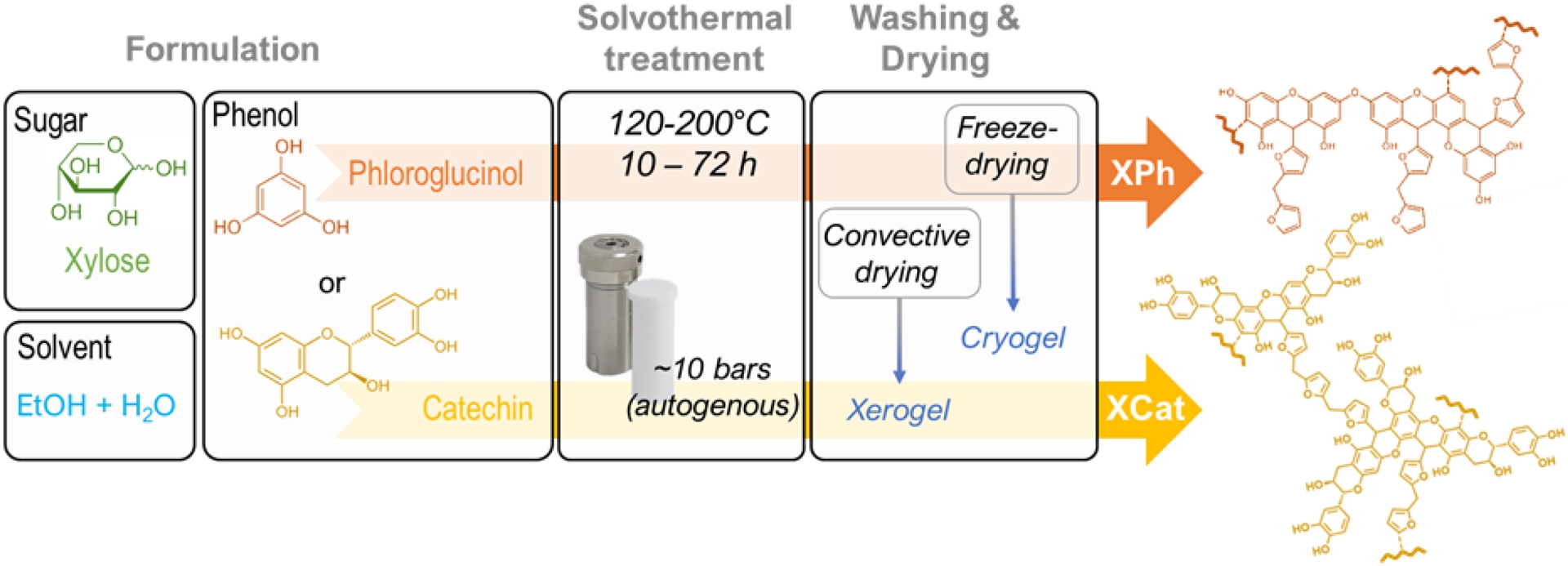 Initially, polymerization occurs between active sites of the phenols and the dehydrated sugars, forming oligomers that gradually assemble into three-dimensional networks through successive steps of nucleation, particle growth, and agglomeration. Within the autoclave, these steps promote the formation of a gel with interconnected pores (ranging from microporosity (<2 nm) to macroporosity (a few micrometers)) filled with liquid. This structure mimics sol–gel processes but is influenced by the composition of the precursors and the applied solvothermal conditions.