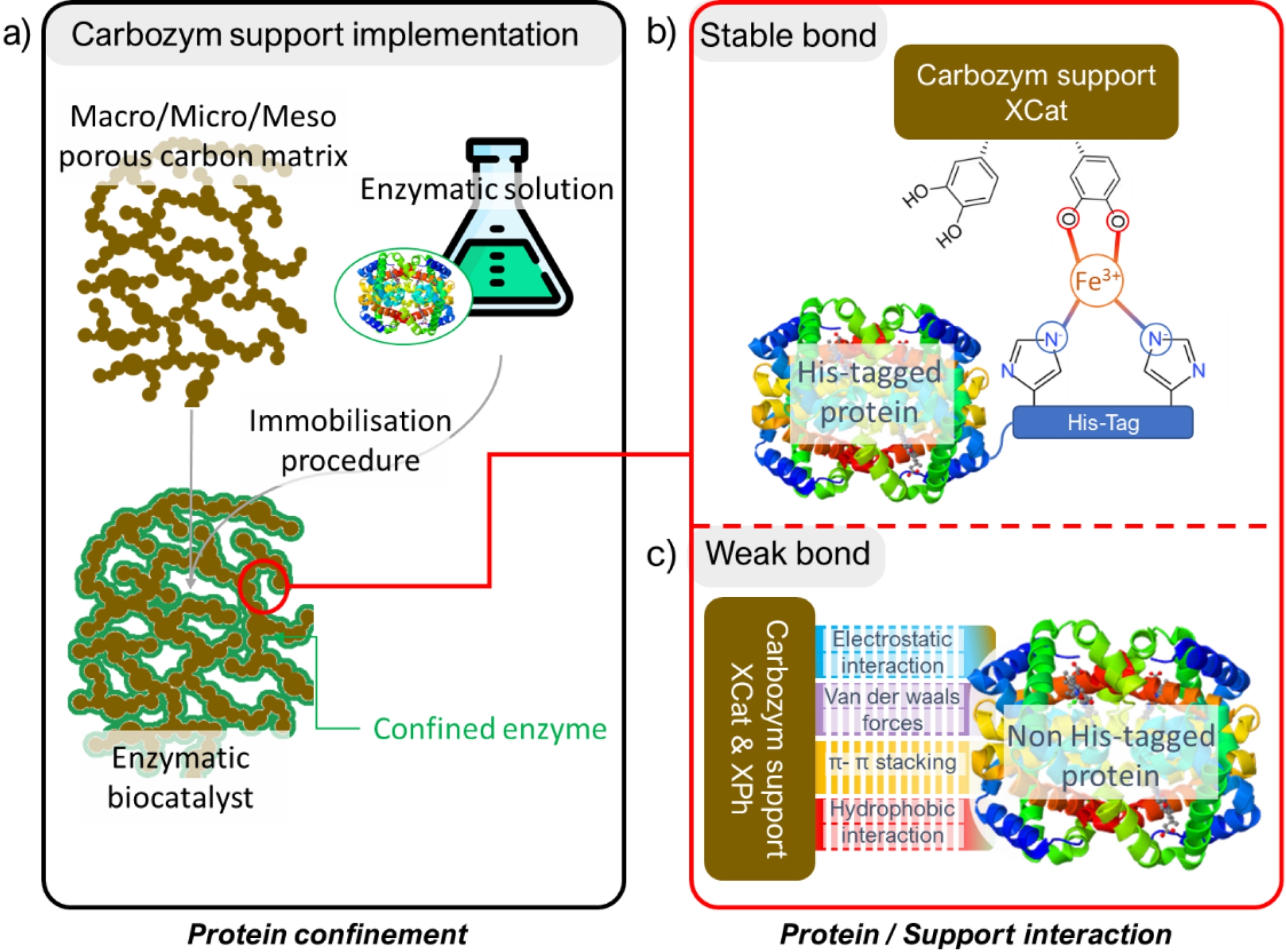 (a) Protein confinement in the CarboZym support; (b) Protein bonding through formation of a stable XCat–Fe3+–histidine complex; (c) Weak bonding of protein through electrostatic interaction, Van der Waals forces, π–π stacking and/or hydrophobic interaction.