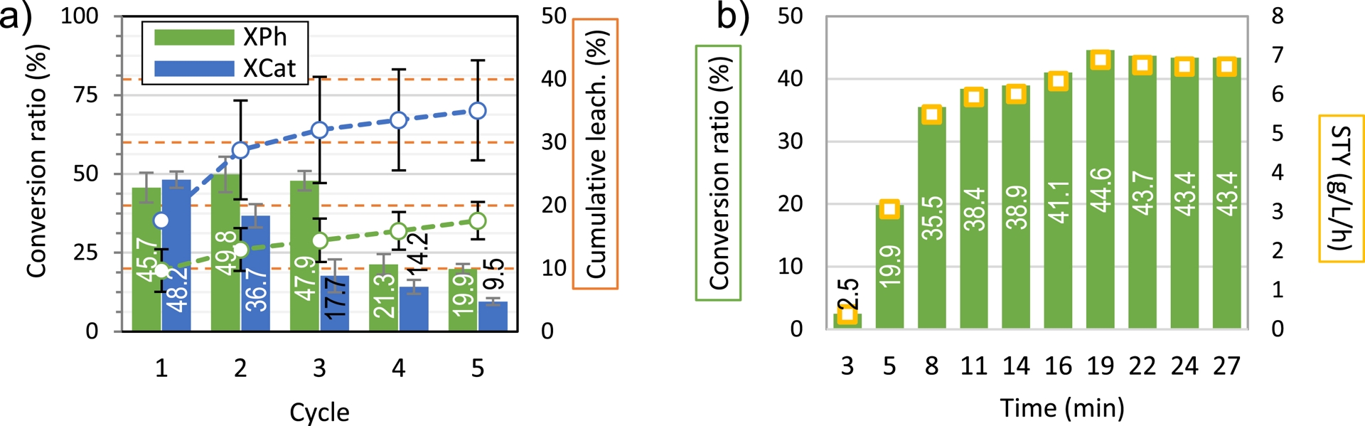 Results for immobilized CALB (a) Batch mode: conversion ratio and cumulative leaching for XPh and XCat support ([buffer: 20 mM Tris-HCl + 1 wt% genapol; pH 7] [immobilization conditions: 10 mg XCat or XPh support—10% (w/w) protein loading—800 rpm; 4 °C]; [reaction conditions: 15 mM pNPB—25 °C]); (b) Continuous mode: conversion ratio and STY ([buffer: same as batch mode] [immobilization conditions: 65 mg support—10% (w/w) protein loading—0.1 ml/min; 4 °C]; [reaction conditions: same as batch mode; circulation mode—5 mM p-NPB—13.3 ml at 0.5 ml/min—5 cycles]).