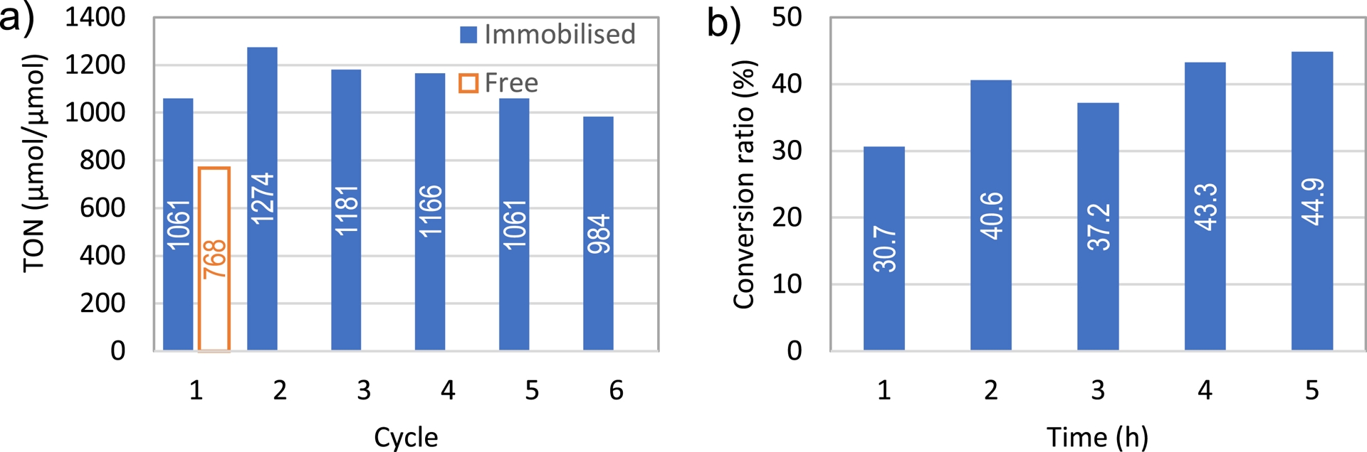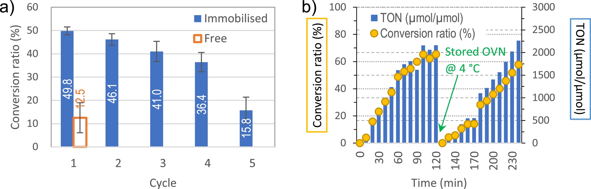 GsOYE was expressed in E. coli with an N-terminal His-tag. Fe-XCat CarboZym support was then chosen to immobilize the protein via coordination with iron bound to XCat material. Such i-GsOYE-Fe-XCat biocatalyst was implemented to catalyze the reduction of cyclohexenone to cyclohexanone (see Figure 4 and Supplementary Information for protocol details). As described in Figure 4a, the biocatalyst was used in batch mode and displays a conversion ratio ∼3.5 times higher than the free enzyme from cycle 1 onwards. It suggests that the enzyme activity can be enhanced upon immobilization. This may be caused by the fact that the immobilized state promotes a more catalytically favored conformation compared to its free form. Reuse of i-GsOYE-Fe-XCat biocatalyst showed that the enzyme can remain active over five cycles (with a mean remaining activity around 32%) resulting in a Total Turnover Number (TTN) of 5868 ± 758 compared with 860 ± 338 for the free enzyme.