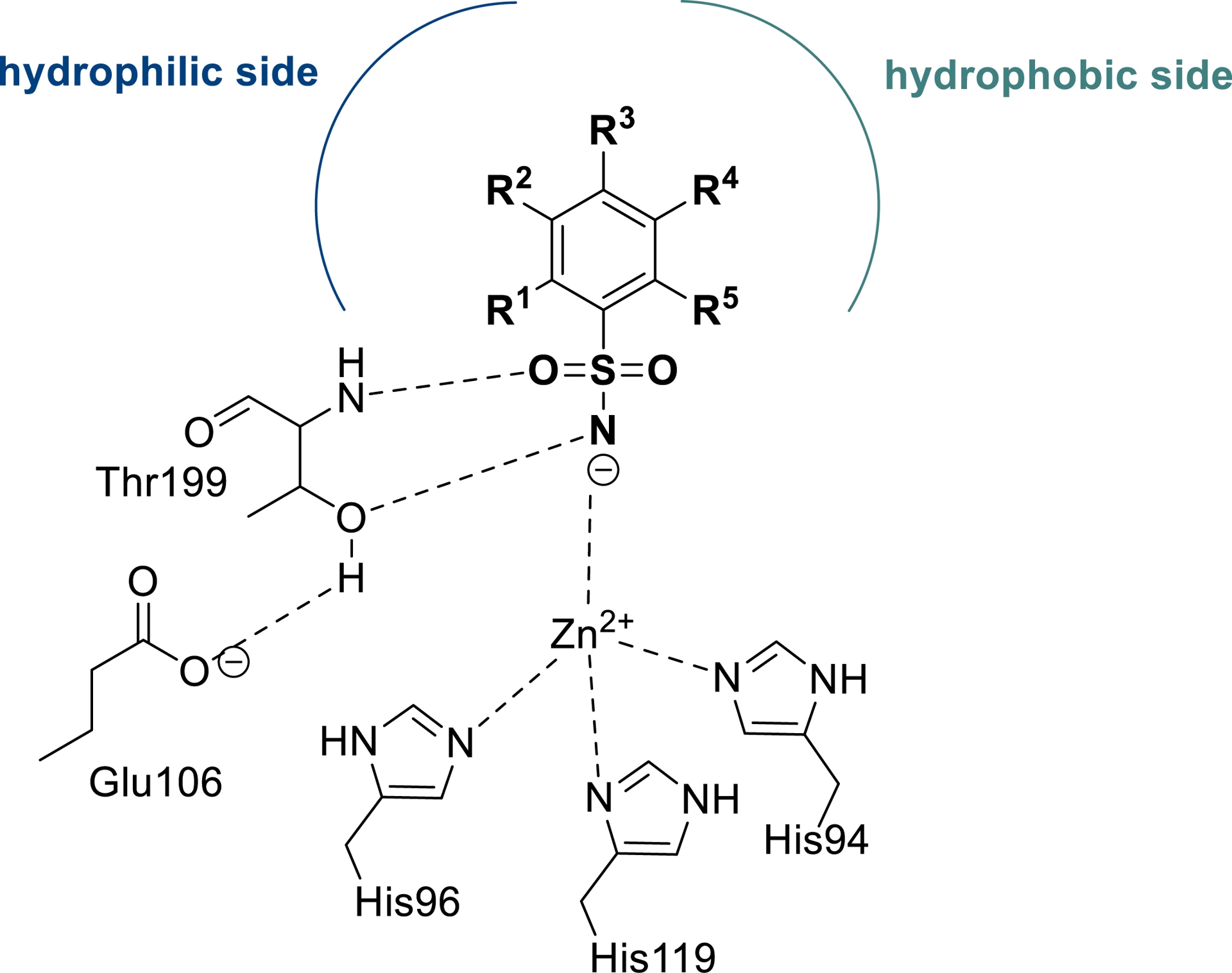 Binding of primary sulfonamide inhibitors to carbonic anhydrase. Key interactions between a generic benzenesulfonamide and the hCA II active site (adapted/redrawn from [1]).