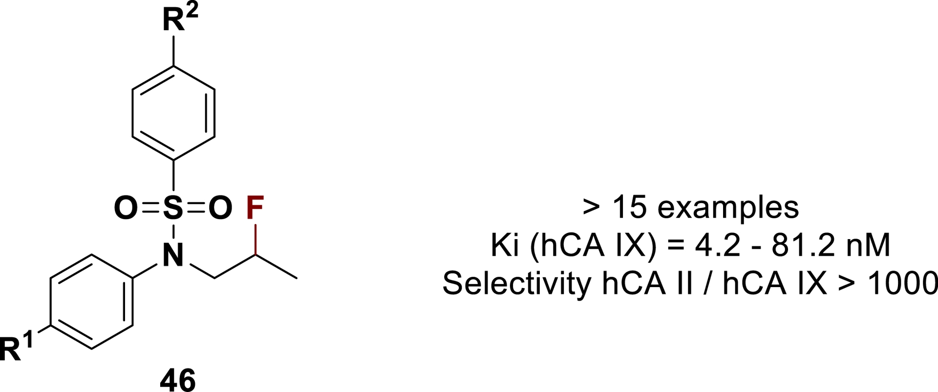 Our recent investigations on the synthesis of fluorinated compounds in superacid led to the identification of a series of fluorinated tertiary benzenesulfonamides 46 acting as selective hCA IX inhibitors (Figure 2) [146, 147]. Almost all of the proposed compounds in this fluorinated series were shown to be highly selective tumor-associated CAIs that did not inhibit the widespread off-target isoform hCA II, showing a new mode of inhibition of tumor-associated CAs by sulfonamides.
