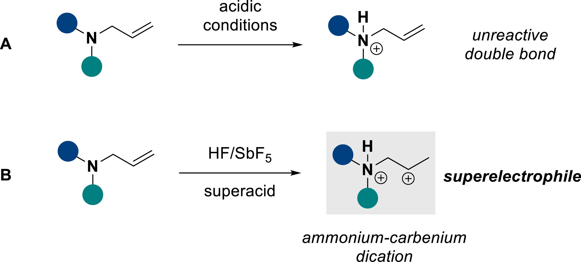 N-allylamines activation in classical acidic conditions vs superacidic conditions (adapted/redrawn from [1]).