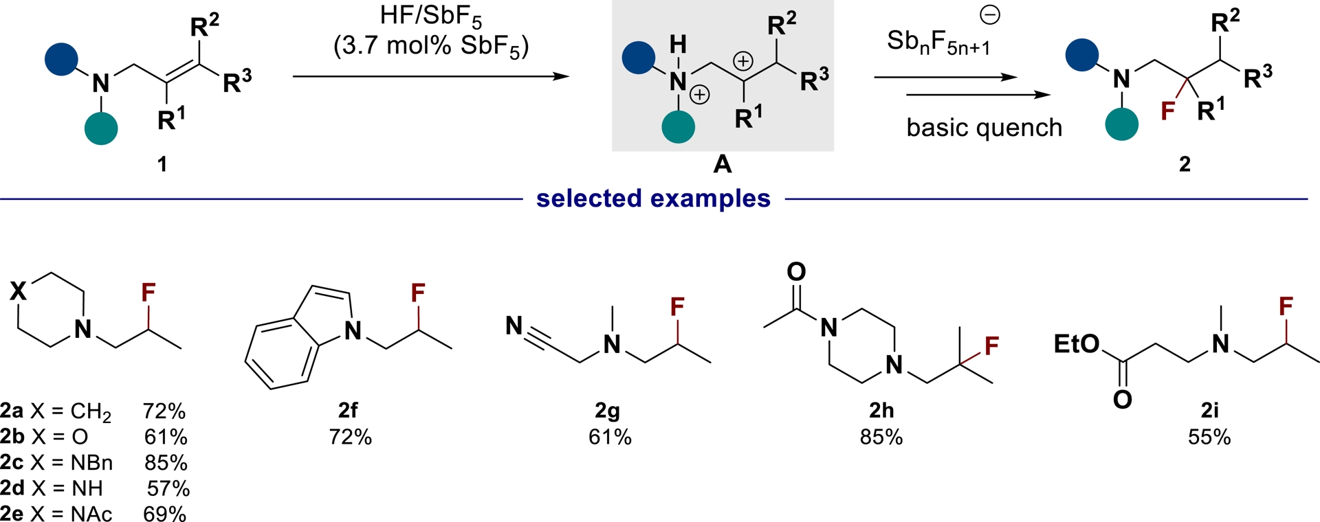 In superacid HF/SbF5, amine 1 can undergo a subsequent protonation of the alkene moiety to form ammonium–carbenium dication A (Scheme 2). While the “non-coordinating” properties of fluoroantimonate anions were largely exploited in catalysis to tune catalyst properties [39], ammonium–carbenium superelectrophilic activation overcomes the non-coordinating anions’ properties [40]. The electron-withdrawing effect of the proximal protonated nitrogen-based group enhances the superelectrophilic character of the dication A, allowing its trapping by $\mathrm{SbF}_{6}^{-}$ or $\mathrm{Sb}_2\mathrm{F}_{11}^{-}$ anions [41, 42], resulting in the formation of the corresponding fluorinated amines 2 in good yields [43, 44].