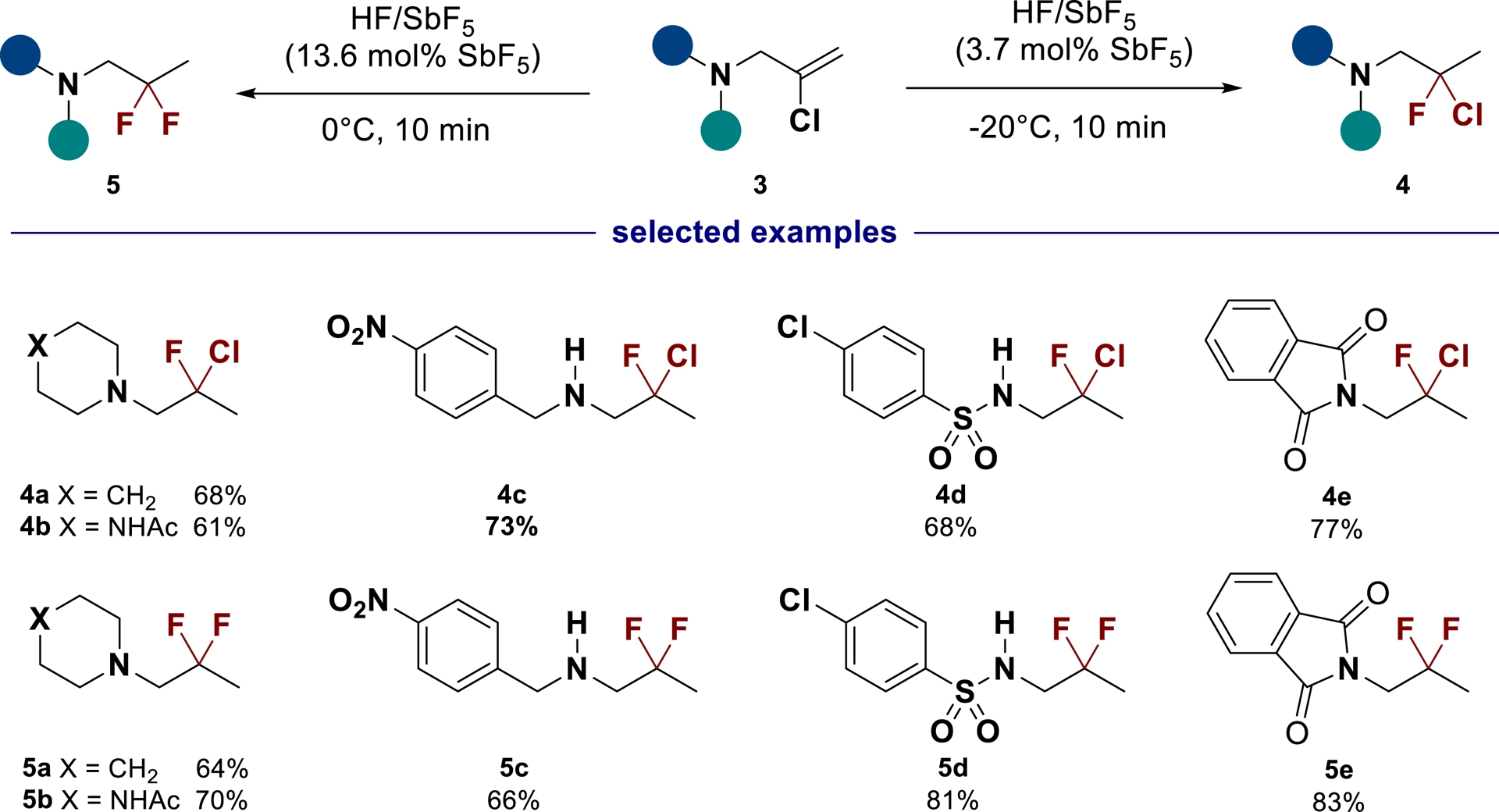 Gem-chlorofluorinated N-containing derivatives 4 (successfully applied to amines, amides, sulfonamides and imides with good yields 68–83%) at −20 °C or the corresponding gem-difluorinated products 5 under more acidic conditions at 0 °C can be easily obtained by applying the previously described method to chlorine-substituted olefins 3 (Scheme 3) [45].