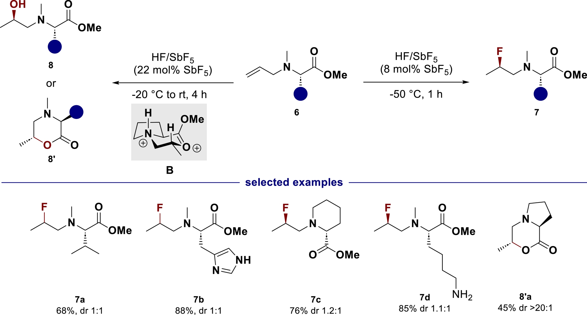 We have recently explored this strategy for the diastereoselective hydrofunctionalization of allylic amines derived from natural amino acids [46]. In this case, the reaction mechanism involves the accumulation of chiral cyclic ammonium–carboxonium dications after a tandem diastereoselective proton transfer/intramolecular cyclization from N-allyl substituted amino esters (Scheme 4). The latter can then react inter- or intramolecularly to furnish fluorinated amines 7, amino alcohols 8 or amino lactones 8′ depending on the reaction conditions. The diprotonation of unsaturated amino esters followed by a concerted diastereoselective proton-transfer/cyclization with full diastereocontrolled formation of a chiral lactone 8a′ from a L-proline-derived substrate confirms the persistency of a well-tuned chiral dication B which should open interesting synthetic perspectives.