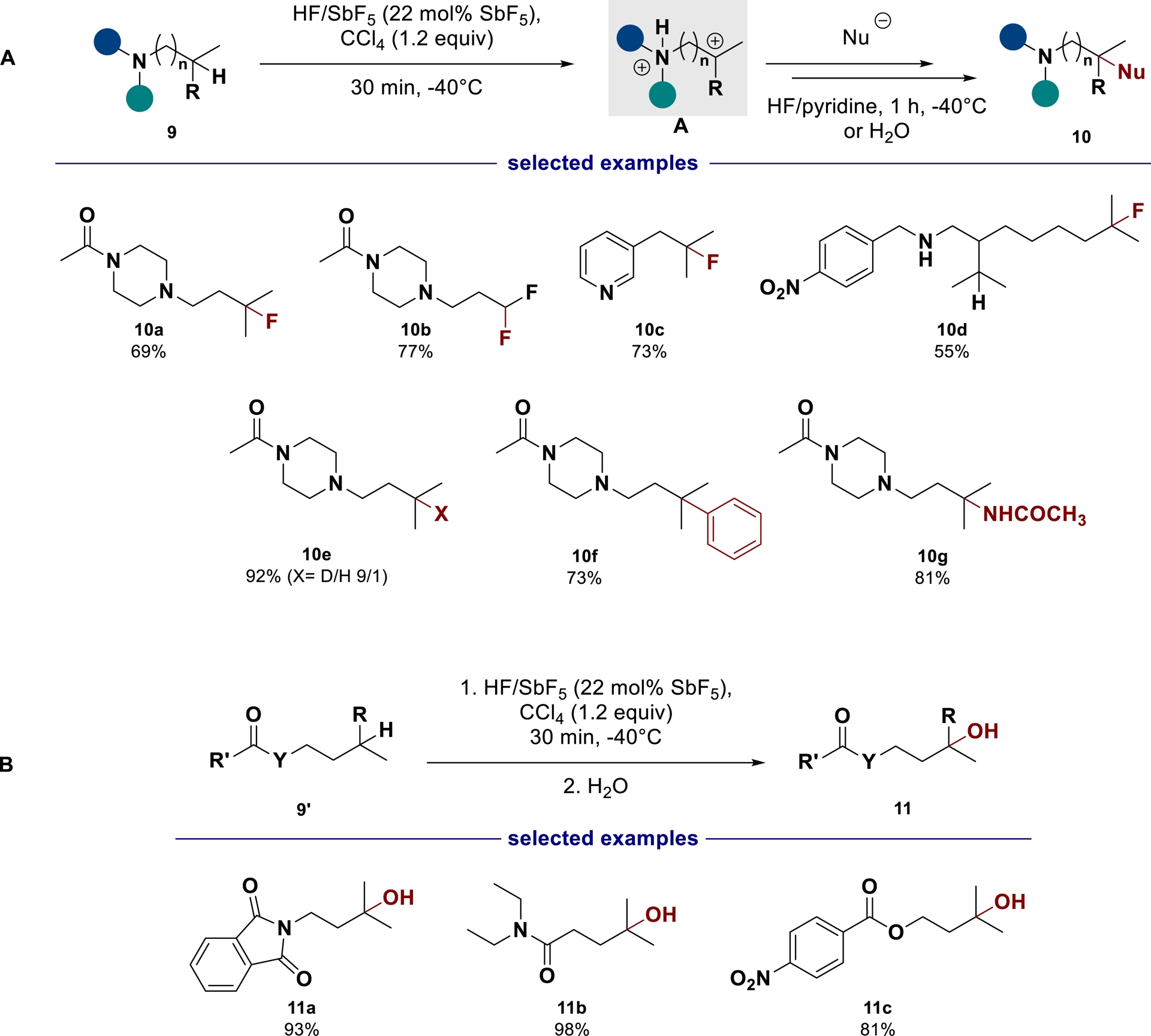 Alternatively, the synthesis of fluorinated amine derivatives can also be achieved from saturated substrates through the superelectrophilic C(sp3)–H bond fluorination of aliphatic amines in superacid [47]. Indeed, by using the hydride abstraction capabilities of CCl$_{3}^{+}$ species in HF/SbF5 conditions [48], we developed a direct strategy to fluorinate unactivated C(sp3)–H bonds of terminal isopropyl moieties in aliphatic amines with moderate to fair yields. This method was also used to introduce other nucleophiles, allowing arylation, amination, and deuteration (Scheme 5A). Extended to amides and esters, the superacid-promoted electrophilic activation can be exploited to generate alcohols 11 in a selective way (Scheme 5B).