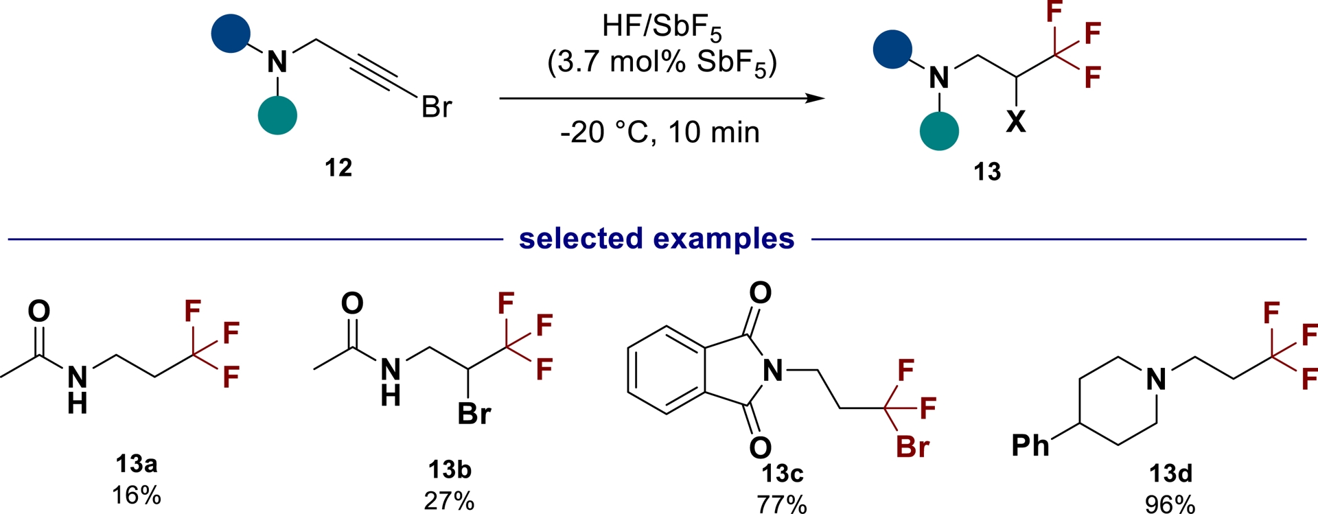 The hydrofluorination reaction in HF/SbF5 can also be applied to alkynes. Starting from 1-bromopropargylic amines 12, the trifluorinated amines 13 can be synthesized with moderate to good yields (Scheme 6). On the other hand, 1-bromodifluoroamines or 2-bromo-1,1,1-trifluorinated products may be isolated depending on the amine substitution and reaction conditions [49].