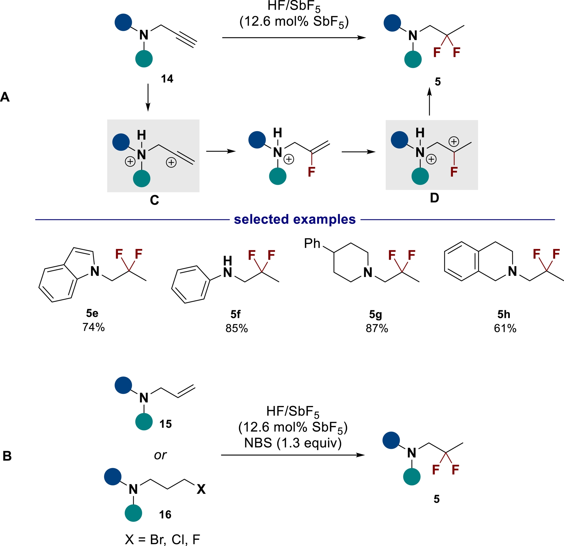 The gem-difluorination reaction can also be efficiently achieved from propargylic amines 14 in HF/SbF5 through the successive formation of dicationic superelectrophiles C and D to afford the gem-difluorinated products in good yields (Scheme 7A) [50]. As an alternative method, the gem-difluorinated amine derivatives could also be obtained through oxidative gem-difluorination in the presence of N-bromosuccinimide (NBS) from allylic or haloamines (Scheme 7B).