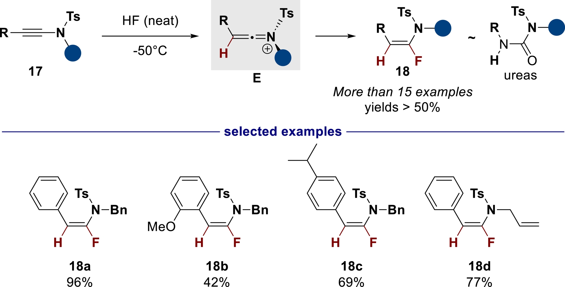 Over the past decades, because of their singular physicochemical features [51], ureas have seen a renewed interest in chemistry-related fields with remarkable applications (organocatalysts [52, 53], anion chemosensors [54, 55], and artificial membranes [56, 57]). Furthermore, the recent development of urea-based anticancer compounds [58, 59] highlights their potential as key structural elements and/or pharmacophores in medicinal chemistry. Thus, generating bioisosters from this functional group is an area of interest for the pharmaceutical industry [60, 61, 62]. Considering the well-known bioisosterism between fluoroolefins and amides [63] and the scarcity of reported urea bioisosters in SAR studies [64, 65, 66], we have developed, in collaboration with the Evano group, the first stereoselective hydrofluorination of ynamides 17 in HF as an entry to α-fluoroenamides 18, potent urea bioisosters (Scheme 8) [67]. In neat HF conditions, after protonation, extremely reactive keteniminium intermediates E can be further stereoselectively fluorinated (sterically-favored incoming approach of the fluorinating agent) to produce fluoroenamides 18 in excellent yields. A similar reaction can also occur in HF/pyridine systems [68], prompting us to develop a semi-empirical approach to determine the acidity of HF/base mixtures [69].