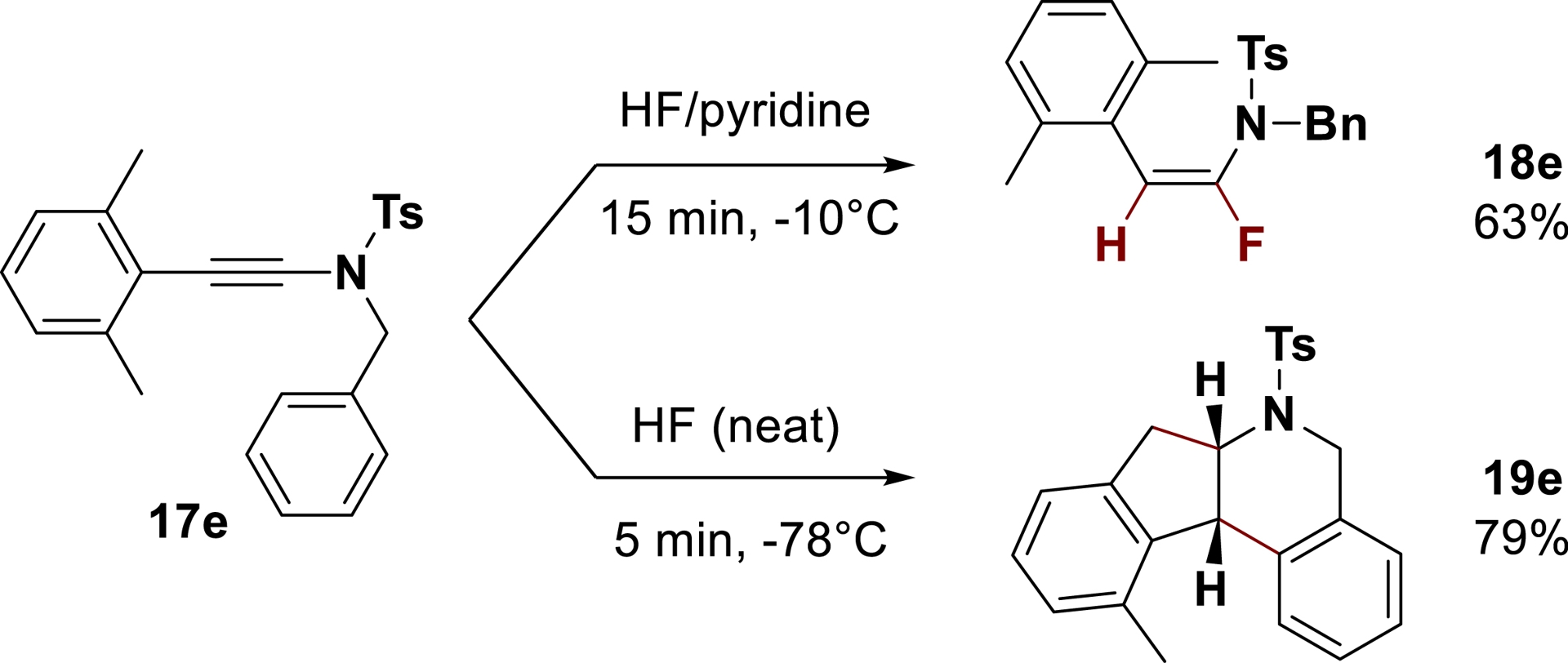 Surprisingly, while the targeted fluoroenamide 18e was isolated in 63% yield from ynamide 17e after reaction at −10 °C in HF/pyridine, the tetracyclic compound 19e was generated at −78 °C in neat HF as a single diastereomer in 79% yield (Scheme 9) [70]. With these unexpected results in hand, various acids were screened to further optimize the reaction conditions. The use of triflic acid (TfOH) as well as catalytic amounts of bistriflimidic acid (Tf2NH) in CH2Cl2 provided selectively the polycyclic product 19e in 90% yield. The method designed was exemplified to a large range of substrates (more than 15 examples) with good yields and was successfully applied to chiral ynamides and bis-ynamides, allowing larger molecular diversity of the reaction.