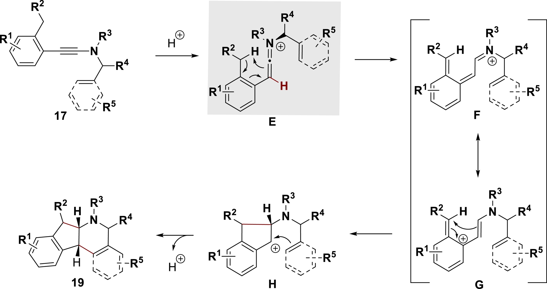 The following mechanism was hypothesized based on a series of experiments using deuterated substrates and reactants, as well as DFT calculations, to justify the original cationic polycyclization of ynamides (Scheme 10). The keteniminium ion E is generated first, followed by a [2, 6]-sigmatropic hydrogen shift from the intermediate F (in resonance with the bis-allylic carbocation G). The first cycle would be generated by a diastereoselective 4π conrotatory electrocyclization, resulting in H. The tetracycle and its cis ring junction would then be formed via a final cyclization of the benzylic cation H.