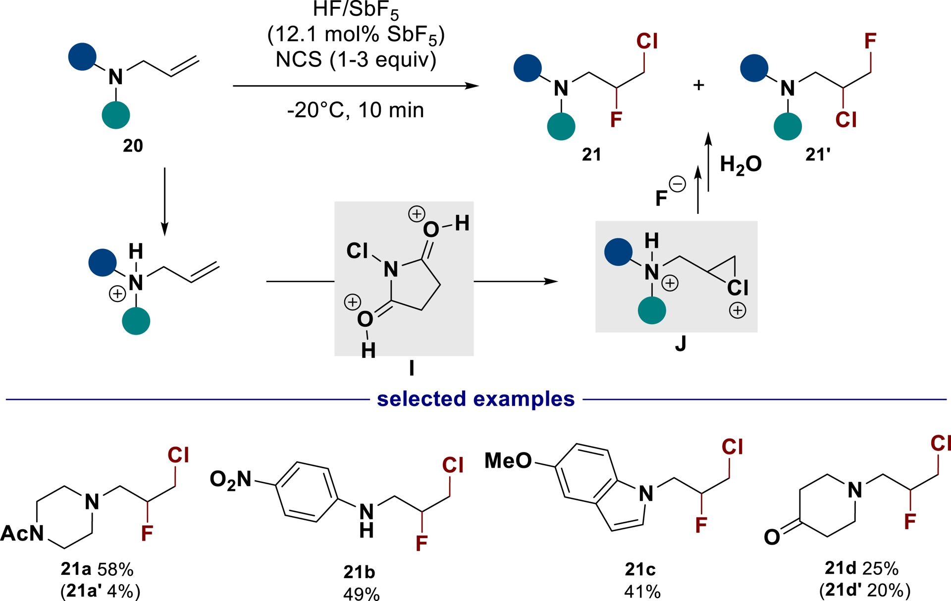 Following our interest in the synthesis of fluoroamine derivatives, we also became interested in the halofluorination of unsaturated amines. While electrophilic activation of alkenes by halonium ion addition has been widely employed to produce new C–C, C–O, C–N, and C–X bonds [71, 72, 73, 74, 75, 76, 77], its application to the halofluorination of allylic amine derivatives is limited to few examples [31, 78, 79, 80, 81, 82, 83]. The combination of HF/base and N-halosuccinimide (NXS) reagents is particularly efficient for the halofluorination of C=C double bonds, although it is significantly less efficient on allylic amine derivatives. Again, the fundamental challenge in applying chlorofluorination to unsaturated amines is the significant decrease in nucleophilicity of the double bond after protonation of the amino group, which prohibits any interaction with a halonium ion source [84]. In this regard, tandem superelectrophilic activation of unsaturated nitrogen-containing compounds with N-chlorosuccinimide (NCS) was discovered to be a useful alternative to address this difficulty (Scheme 12) [85]. In superacid, the classical chloronium ion source NCS can be activated through the protonation of both carbonyl groups as showed by low temperature NMR experiments. In these conditions, NCS—activated as superelectrophilic species (I)—is reactive enough to allow the formation of chloronium ion J from amine 20. The fluorination of this chloronium ion leads to the corresponding β-fluoro-γ-chlorinated amine 21. This method was found to be compatible with a wide range of unsaturated nitrogen-containing substrates.