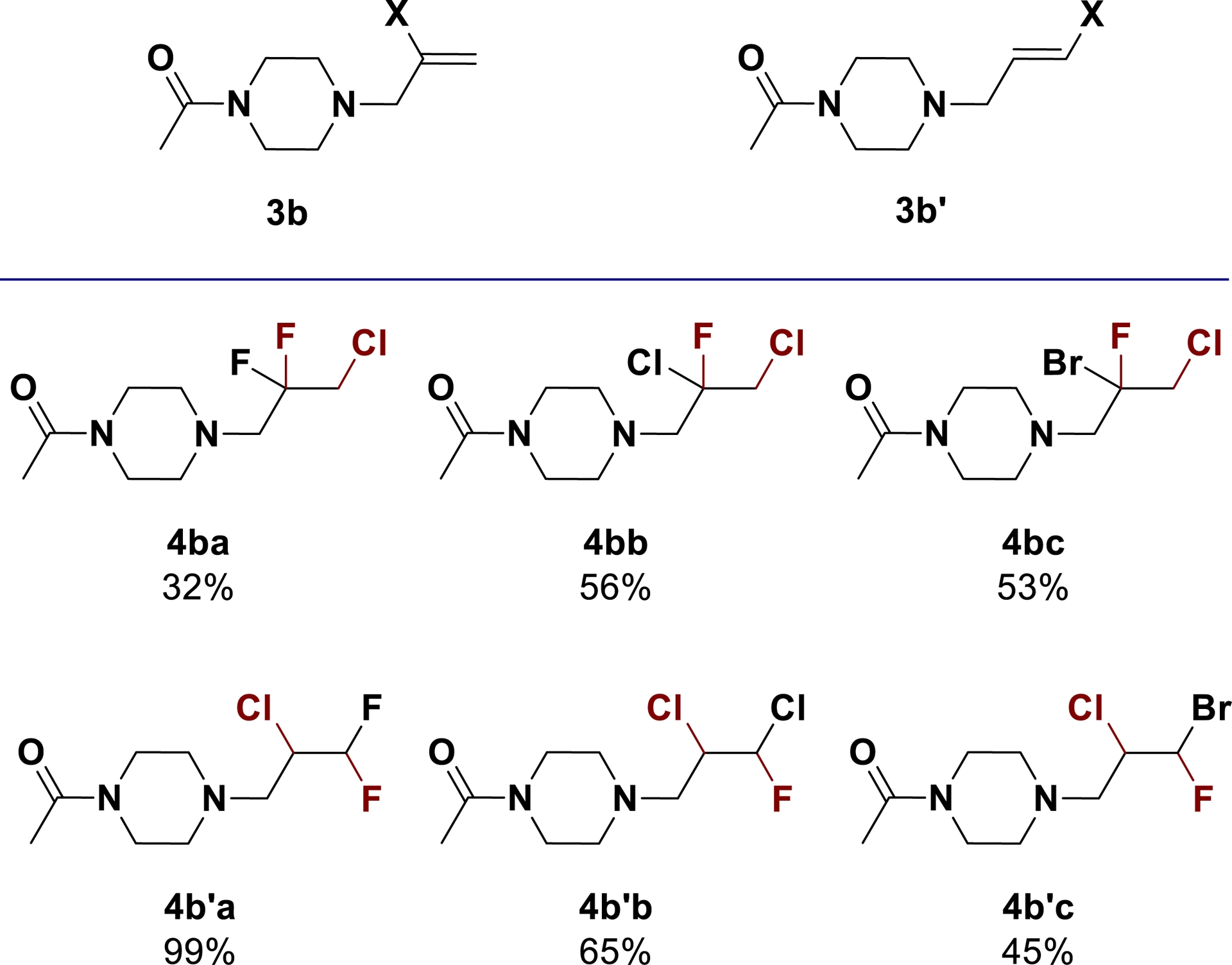 Directed by a halogen substituent on olefins 3b and 3b′, chlorofluorination demonstrated good efficiency for the synthesis of original and high-valued polyhalogenated building blocks in relatively good yields (Scheme 13).