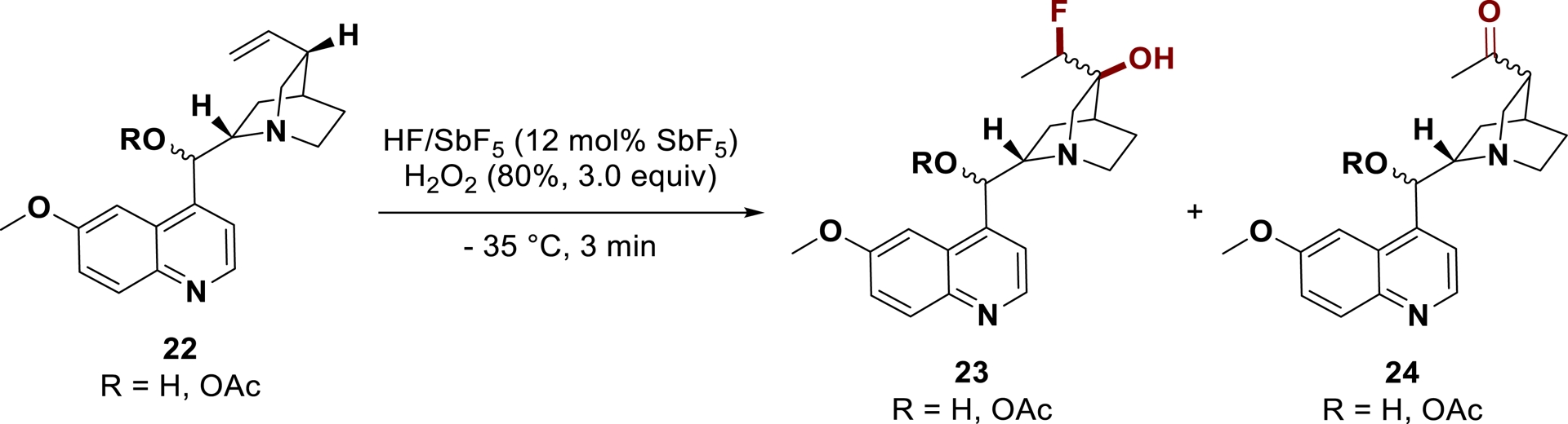 Our group has also shown that 1,2-oxyfluorination of unsaturated amines can be performed in the presence of hydrogen peroxide. Applied to elaborated unsaturated amines such as quinine derivatives 22, fluorohydrins 23 could be synthesized along with ketones 24 (Scheme 14) [86].