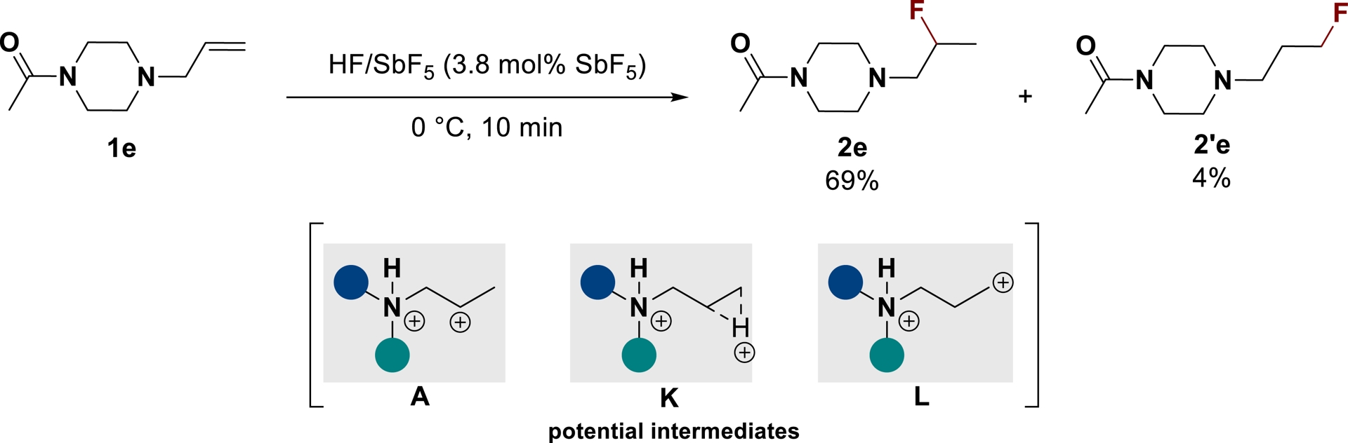 In the course of our work on superacid-mediated hydrofluorination of olefins, the unusual formation of a γ-fluorinated product 2′e besides the desired product 2e from substrate 1e led to a deep mechanistic investigation (Scheme 15) [87].