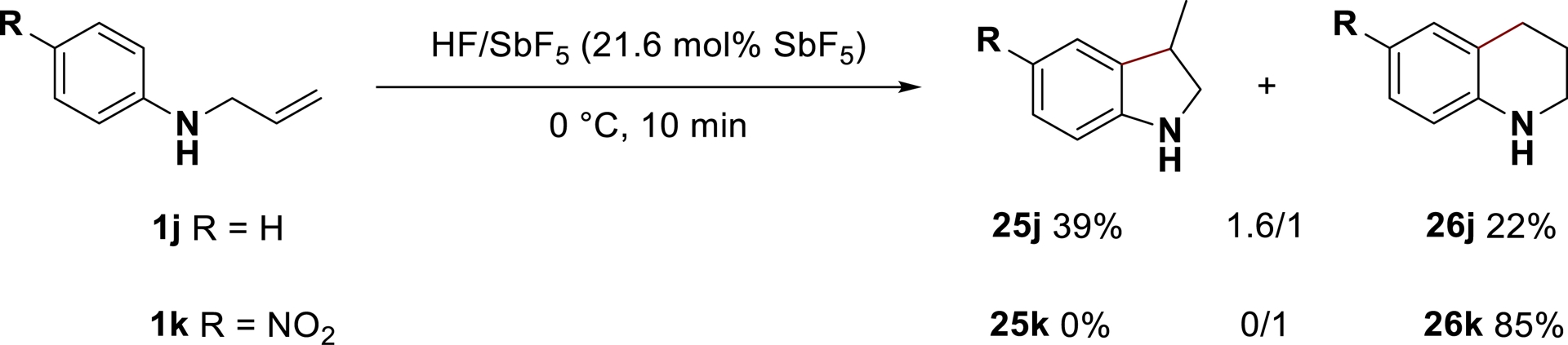 The Markovnikov product 2e and anti-Markovnikov product 2′e may respectively result from the nucleophilic trapping of the secondary carbocation A (β-position) and primary carbocation L (ω-position) [88], or from a nonclassical intermediate K (μ-hydrido-bridged structure) [89, 90]. By submitting fluorinated products 2e and 2′e to HF/SbF5, both compounds were found to be in a thermodynamic equilibrium via the C–F bond activation/carbocation formation/fluorination process under the reaction conditions. As a consequence, intramolecular trapping of the generated cationic intermediate through stable C–C bond formation was proposed. As previously stated, starting from N-allylic aniline derivatives, intramolecular trapping of the generated carbocation with aromatics enabled the synthesis of indolines 25 and tetrahydroquinolines 26, which were found to be stable under the reaction conditions. A significant difference in behavior was noticed between anilines substituted with electron-donating or electron-withdrawing groups. For example, the reaction of aniline 1j led to a mixture of products 25j and 26j in a 1:6:1 ratio while nitro-substituted substrate 1k transformed only into the tetrahydroquinoline 26k (Scheme 16).