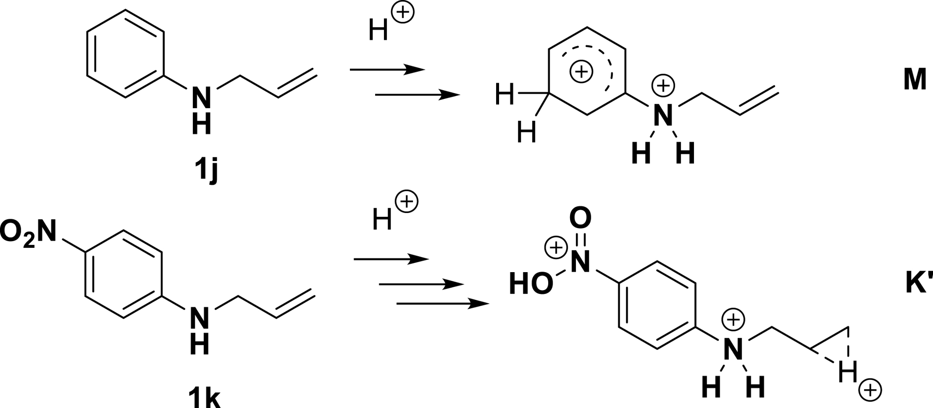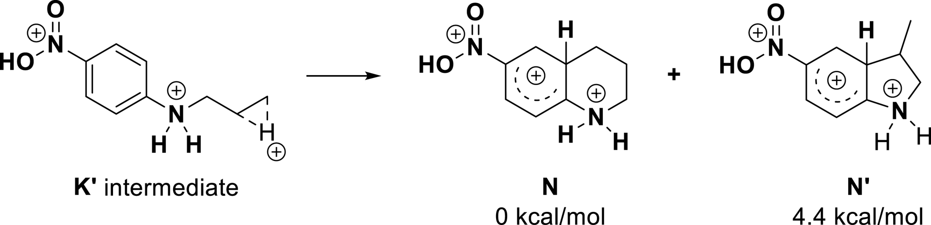 As a result, the selectivity for the production of six-membered ring products from deactivated substrates was attributed to the relative stabilities of Wheland intermediates N and N′ emerging from cyclization via trapping of intermediate K′ (Scheme 18). In the case of substrate 1k, the energy difference between intermediates N and more strained N′ is responsible for the formation of the tetrahydroquinoline product.