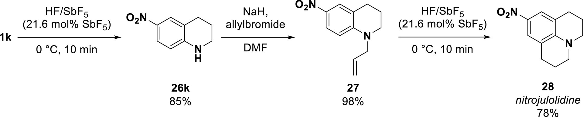 This anti-Markovnikov process was then used to prepare nitrogen-containing polycyclic molecules [91]. Starting from substrate 1k, through a tandem cyclization/allylation/cyclization process, the nitro-substituted julolidine 28 was synthesized in an overall yield of 65% (Scheme 19).