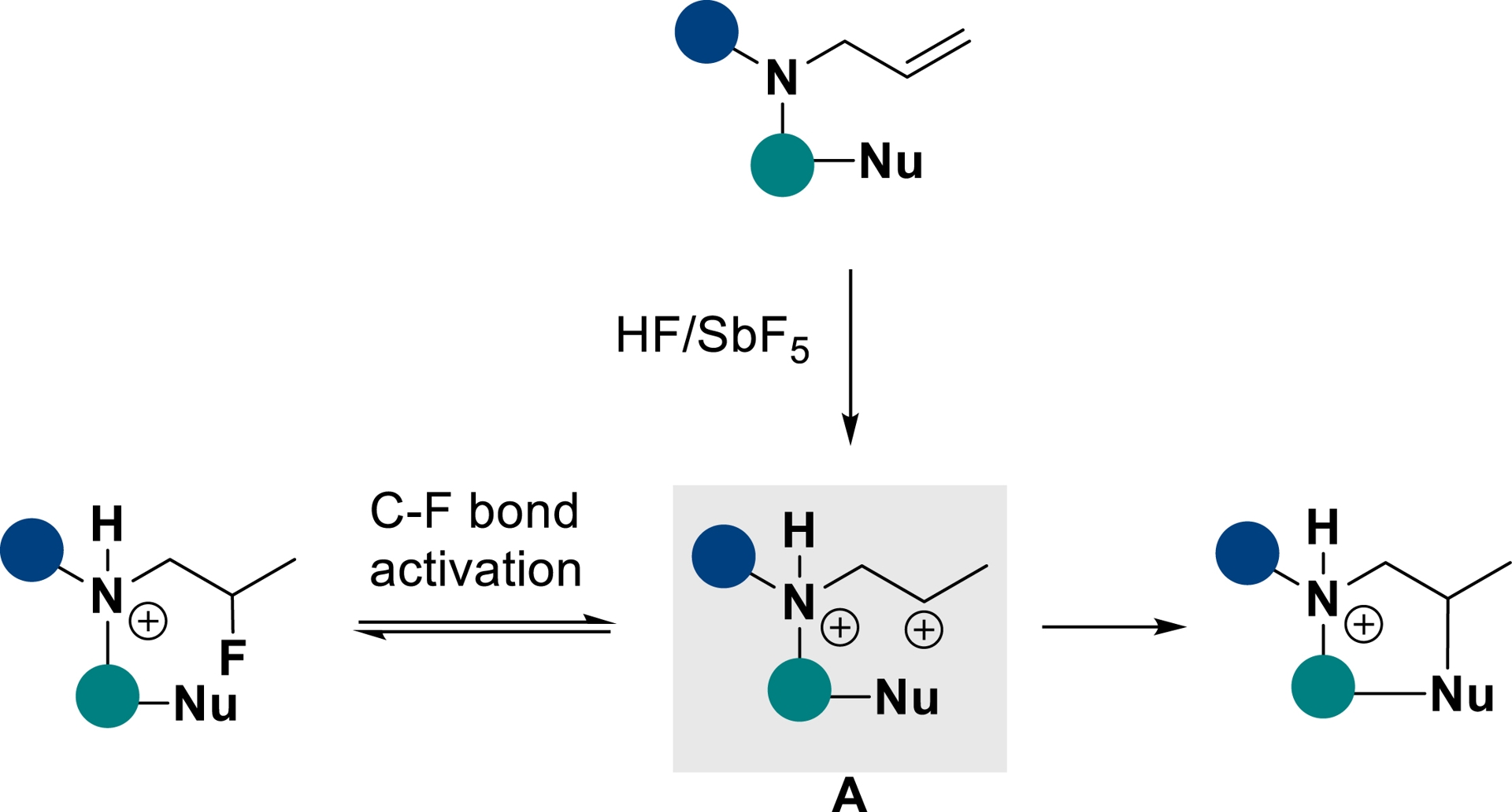 C–F bond activation and intramolecular trapping of ammonium–carbenium dications in HF/SbF5 (adapted/redrawn from [1]).