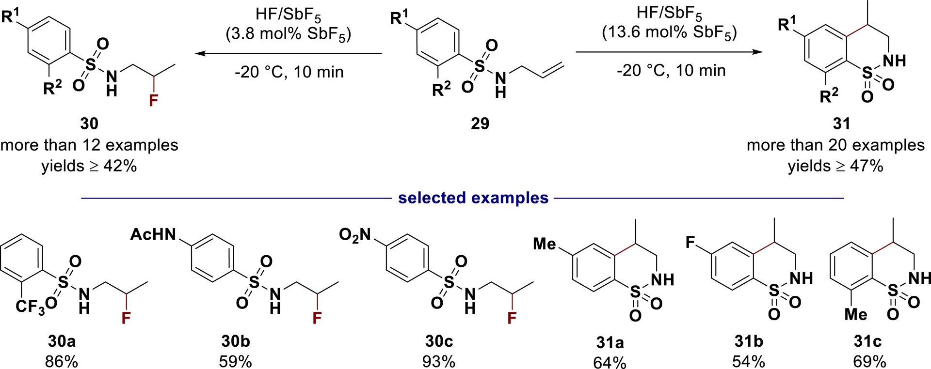 Exploiting the stability of fluorinated products (obtained from hydrofluorination reactions) in HF/SbF5 (SbF5 loading ⩽ 10 mol%), and the ability to activate C–F bonds at higher acidity with a concomitant decrease in the nucleophilicity of the fluoride ions, fluorinated sulfonamides 30 and benzofused sultams 31 can be selectively synthetized from N-allyl-benzenesulfonamides 29 (Scheme 21) [100]. With this method, a large variety of products 30 and 31 incorporating alkyl, halogen, amide, ester, ketone, and other functions were generated in good yields.