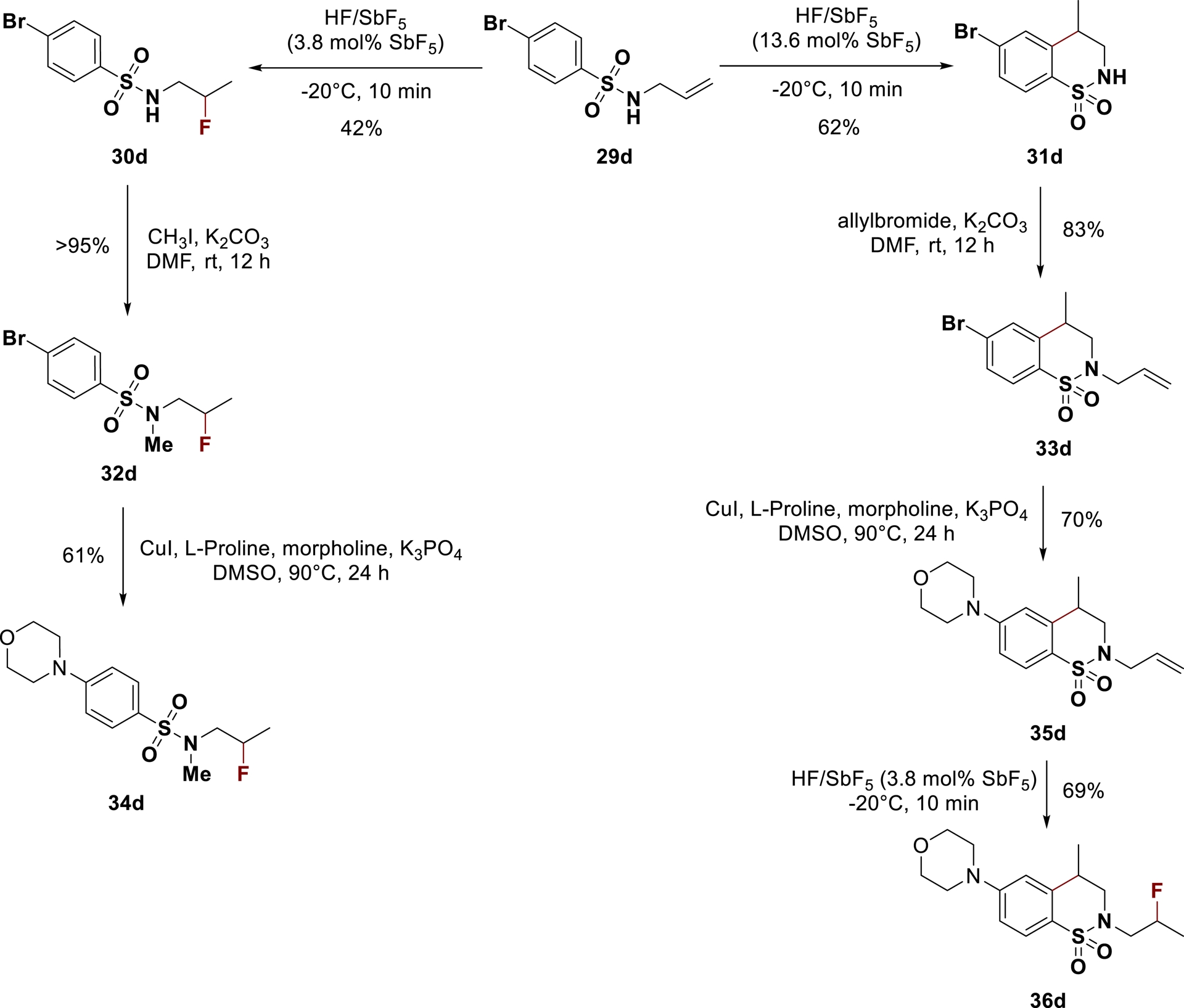 Given that amino-benzenesulfonamide derivatives and their cyclic analogues are interesting targets for various therapeutic applications (inhibition of matrix metalloprotease [101], carbonic anhydrases [94, 95, 102] or HIV protease [103, 104] for instance), the method described above was next applied to their synthesis. A complete set of fluorinated 4-aminobenzofused sultams and fluorinated 4-aminobenzenesulfonamides could be produced from halogen-substituted derivatives using a combination of superacid-mediated cyclization/hydrofluorination and Ulmann-type coupling with amines [105]. For instance, starting from brominated N-allyl-benzenesulfonamide 29d, fluorinated 4-morpholino-benzenesulfonamide 34d and fluorinated 4-morpholino-benzofused sultam 36d were synthesized in overall good yields, confirming the synthetic potential of this method (Scheme 22).