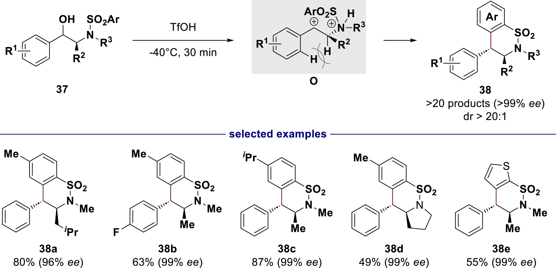Using the stability of benzylic carbocations and their restricted conformation due to benzylic strain [106, 107], we hypothesized that starting from simple N-(arenesulfonyl)-ephedrine derivatives 37, dicationic intermediate O could be generated under superacidic conditions. It would react diastereoselectively, to afford enantiopure benzosultams 38 [108]. Taking advantage of the chiral pool, a number of optically active N-(arenesulfonyl)-amino alcohols were successfully transformed in triflic acid into enantiopure benzosultams with a diverse range of functionalities and substitution patterns (Scheme 23).