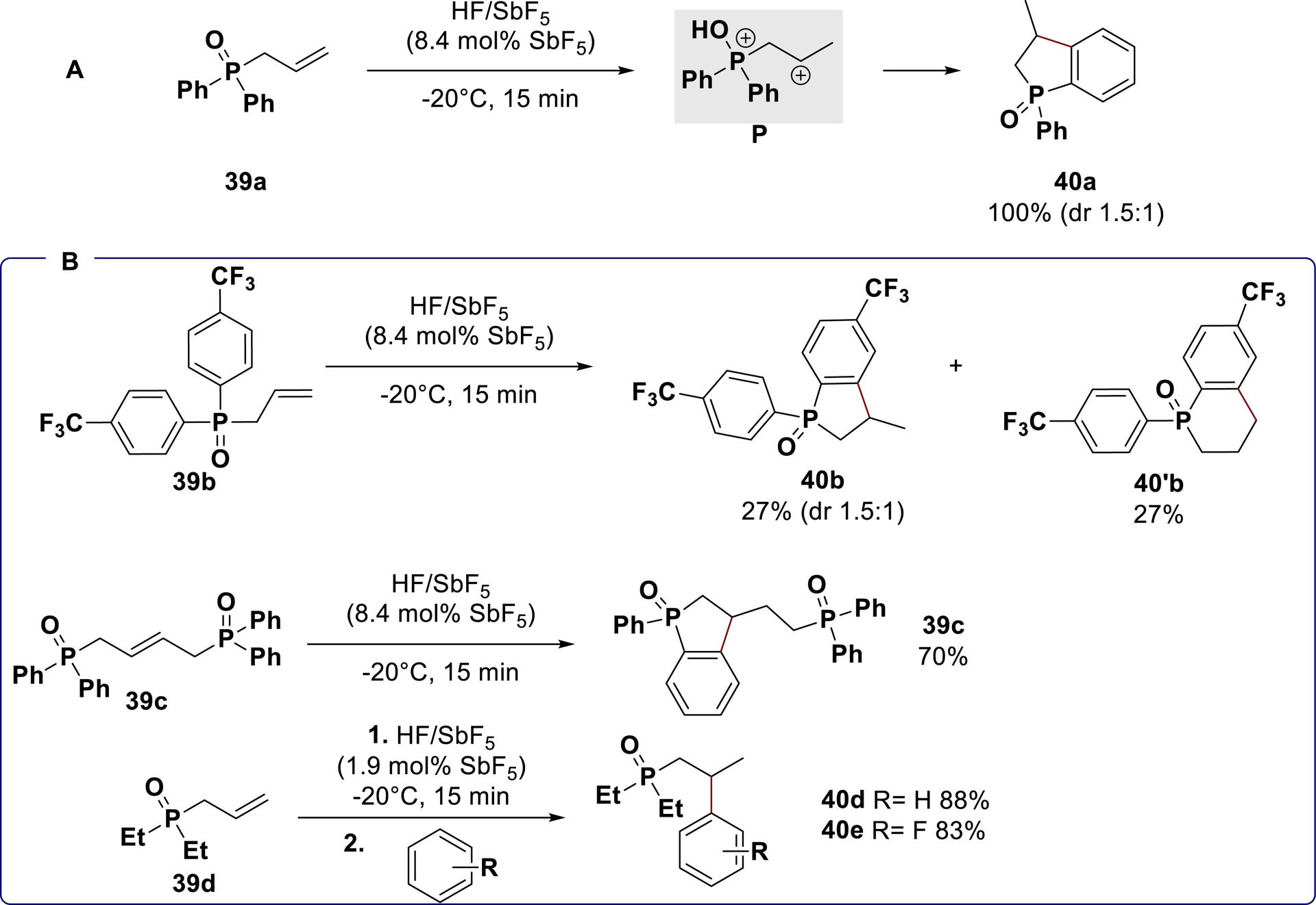 Pursuing our efforts to develop hydrofunctionalization methods, we also turned our attention to organophosphorus derivatives which have found wide application in various fields such as catalysis, medicinal chemistry, and material science [109, 110, 111, 112, 113]. Starting from arylated phosphine oxide derivatives 39a in HF/SbF5 superacid conditions, the cyclized phosphinindoline 40a was generated in a 2/3 mixture of syn/anti diastereomers (Scheme 24A) [114]. The same substrate submitted to anhydrous HF (H0 ≈ −11) or CF3SO3H (H0 = −14) remained unreactive at −20 °C. These results confirmed that activation of the substrate is strongly dependent on the (super)acidity of the medium, a result that is consistent with a superelectrophilic activation process. This hypothesis was further confirmed by in-situ low-temperature NMR experiments and single-crystal X-ray diffraction studies showing evidences for the formation of phosphonium–carbenium dications in HF/SbF5. The superelectrophilic character of these species was exploited in intra- and intermolecular hydroarylation reactions (Scheme 24B).