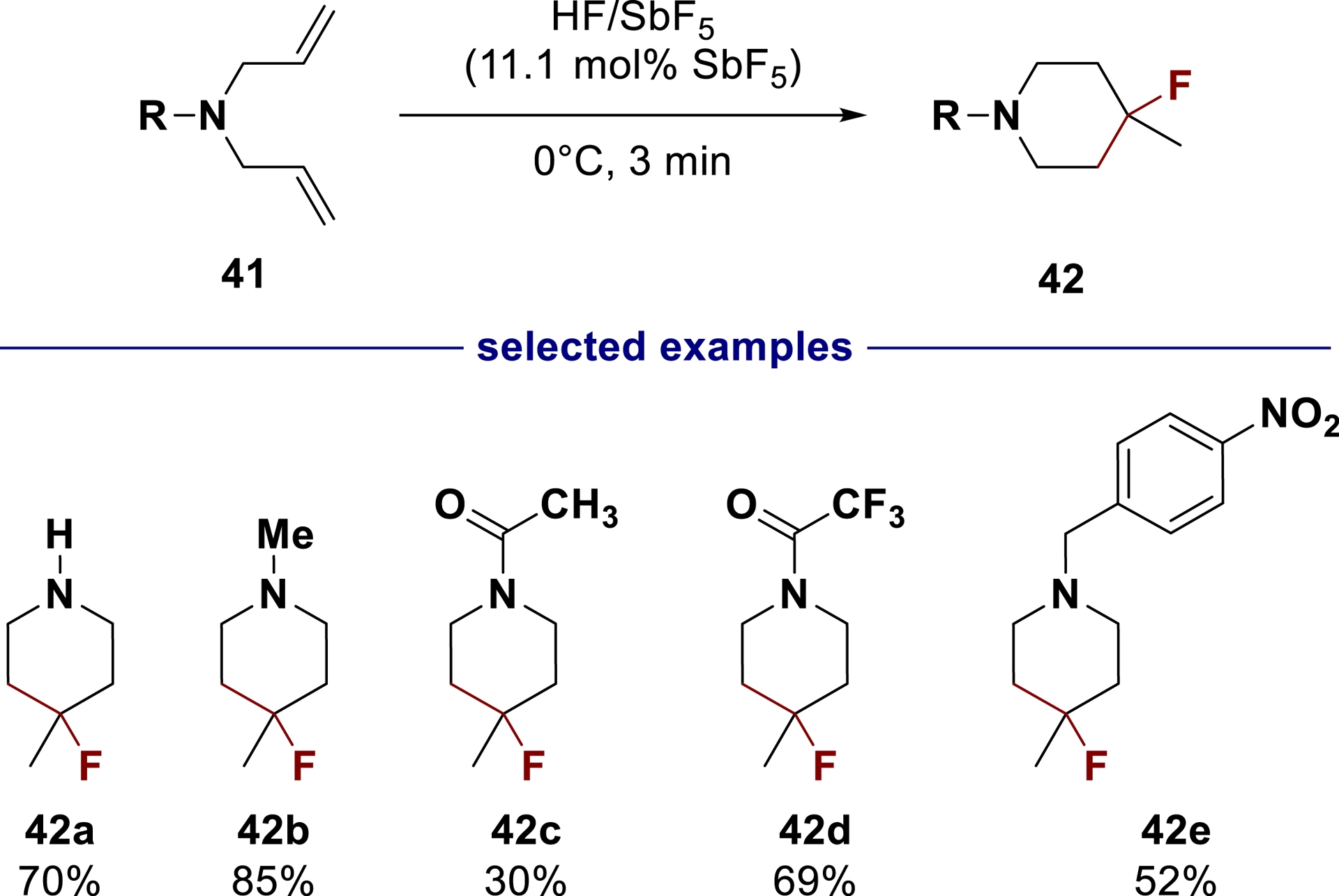 As demonstrated in the synthesis of benzofused sultams, the superelectrophilic nature of ammonium–carbenium dications enables intramolecular trapping with poor nucleophiles. This reactivity was further expanded by utilizing a C=C double bond as a nucleophile. The cyclization/fluorination of differently substituted dienes 41 was found to be a versatile technique to obtain fluorinated piperidines 42 (Scheme 25) [115].