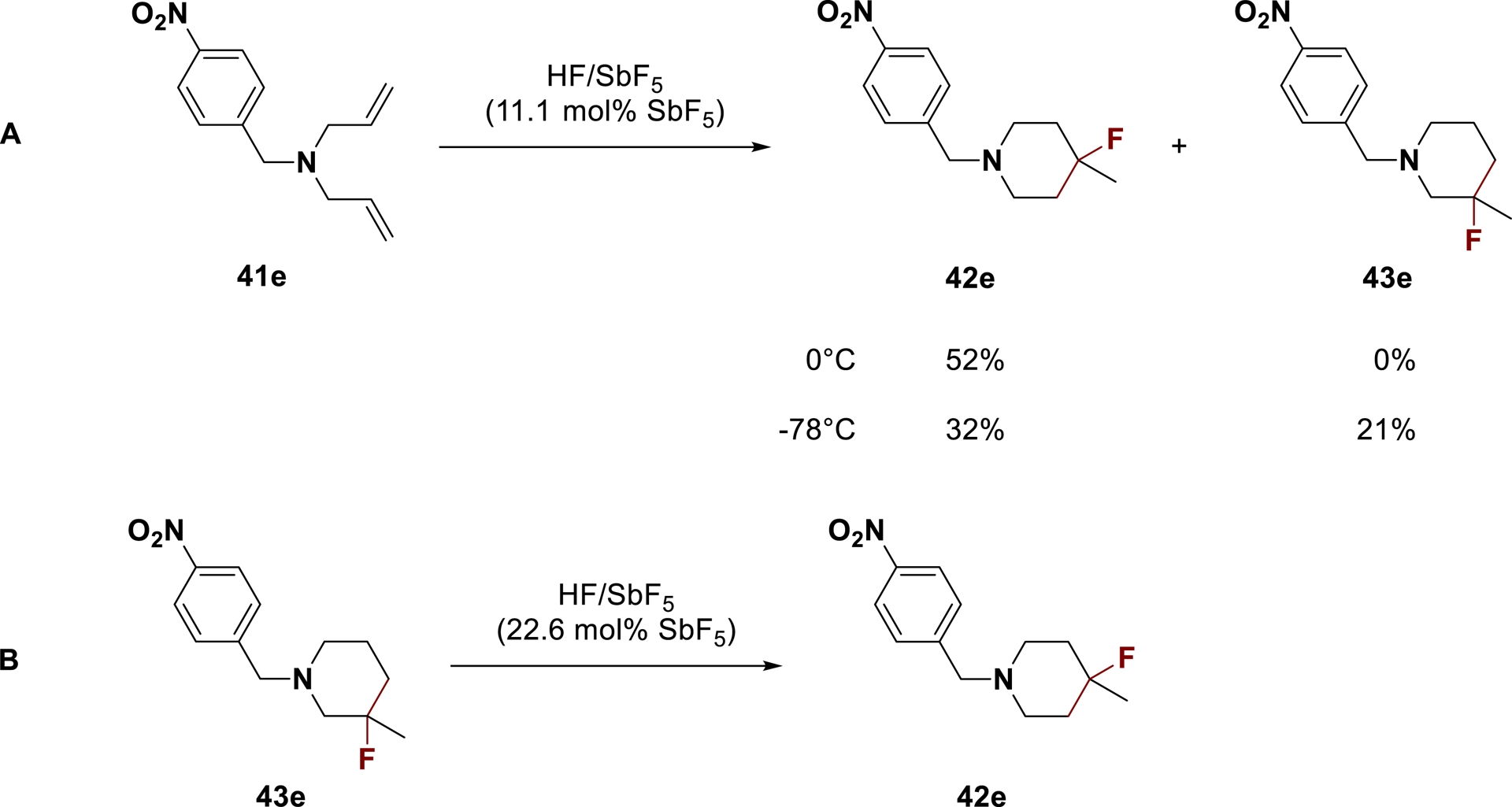 (A) Formation of 3- and 4-fluoropiperidines in HF/SbF5; (B) Formation of 4-fluoropiperidine 41e from 3-fluoropiperidine 42e in HF/SbF5 (adapted/redrawn from [1]).