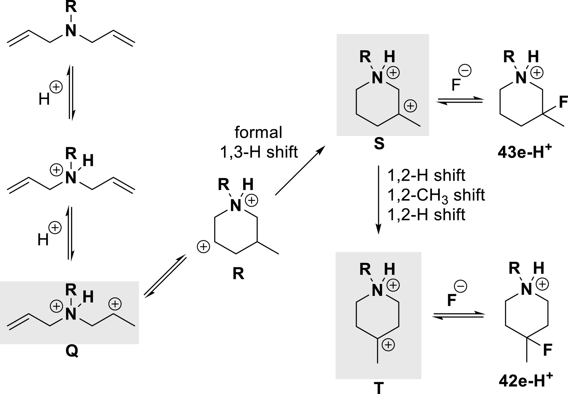 After nitrogen protonation, the superacidity of the medium allows formation of ammonium–carbenium dication Q. Proximity of the charges greatly activates its electrophilic character, permitting nucleophilic addition of the non-protonated alkene (despite electronic deactivation due to the strong withdrawing influence of the proximal ammonium ion), resulting in intermediate R. A sequence of hydride and methyl shifts favors the formation of the more stable dication T through the generation of intermediate S, both respective precursors of 42 and 43 after fluoride ion trapping.