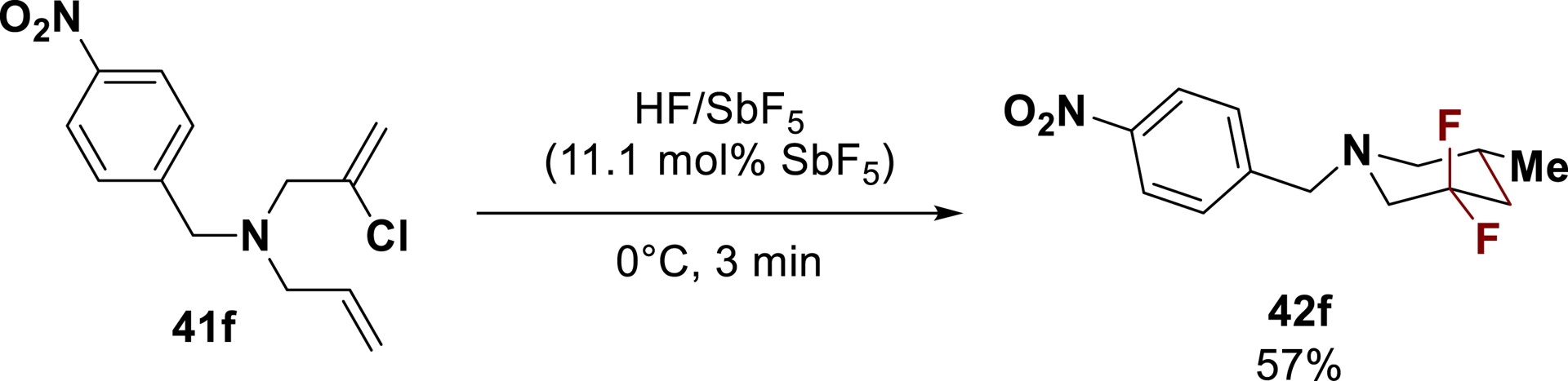 Using superelectrophilic ammonium–α-chlorocarbenium dications allowed the direct preparation of difluorinated piperidines by cyclization and fluorination. Starting from chlorinated N-diene 41f, the difluorinated piperidine 42f was directly synthesized in 57% yield (Scheme 28) [116].