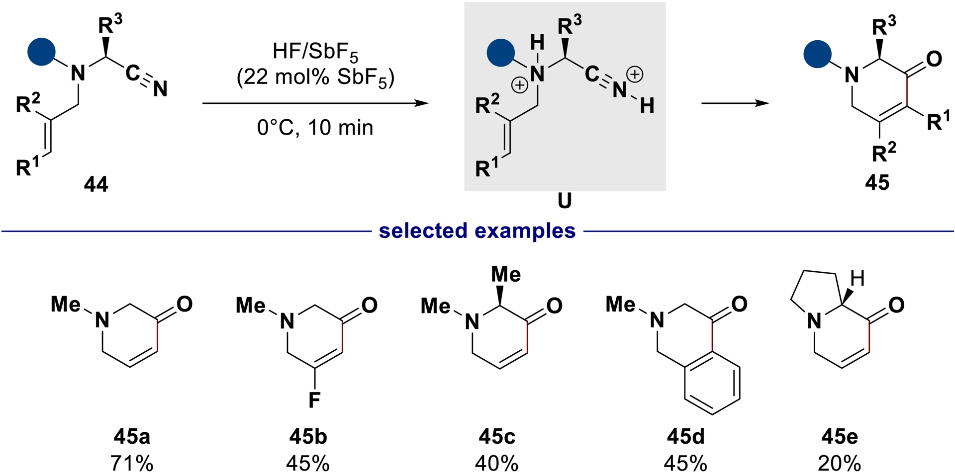 Alternatively, using ammonium–nitrilium dications as superelectrophiles, unsaturated piperidinones can also be synthesized exploiting the alkene moiety as internal nucleophile [47]. These ammonium–nitrilium dications U have been observed and characterized by single-crystal X-ray diffraction analysis and low-temperature NMR experiments in superacid media. Taking advantage of their superelectrophilic character, their intramolecular trapping with poorly nucleophilic alkenes allows straightforward access to high-valued (enantioenriched) piperidin-3-ones 45 (Scheme 29).