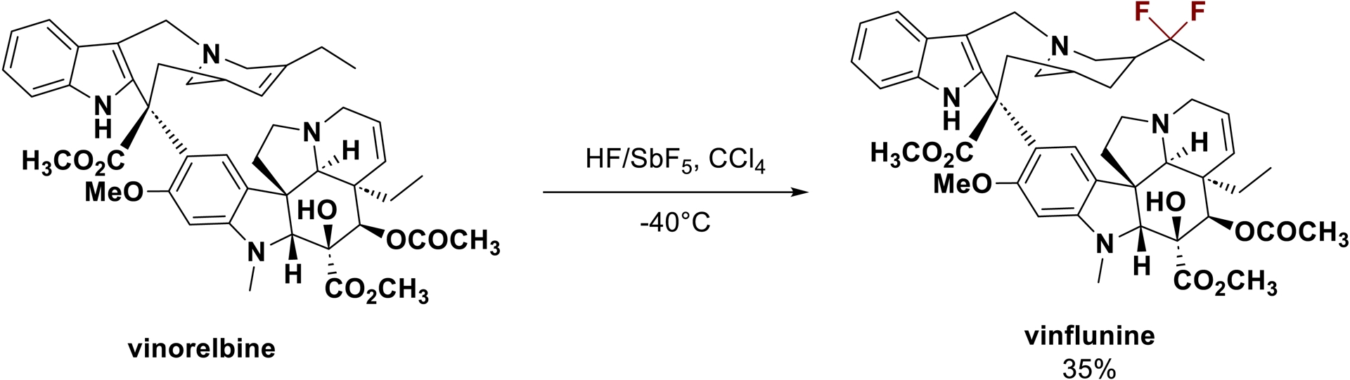 The development of new synthetic methods is essential for the discovery of efficient and selective pharmaceuticals [117]. Jacquesy et al. have shown that activation in superacid medium is a suitable synthetic tool in this perspective, allowing the modification of simple to highly complex molecules and thereby giving access to new analogs [118, 119]. The most notable example is the direct synthesis of vinflunine from a Vinca alkaloid through a direct modification in a HF/SbF5 solution (Scheme 30) [120, 121, 122]. To the best of our knowledge, despite extensive efforts, this anti-cancer agent [123], commercialized under the brand name Javlor®, cannot be synthesized by other synthetic methods [124].