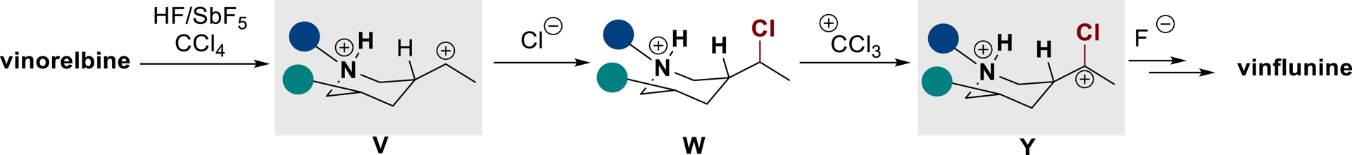 The vinorelbine starting material reacts with HF/SbF5 to form a superelectrophilic ammonium–carbenium dication V which can be chlorinated in the presence of CCl4 to generate intermediate W along with chlorocarbocation $\mathrm{CCl}_{3}^{+}$. The latter can act as a hydride-abstracting agent (as shown above on some standard building blocks) [48], allowing the ionic electrophilic activation of the C–H bond which leads to superelectrophile Y. Its subsequent fluorination and halogen exchange allow delivering vinflunine (Scheme 31). A similar strategy has also been applied to diverse Cinchona alkaloids [125, 126].