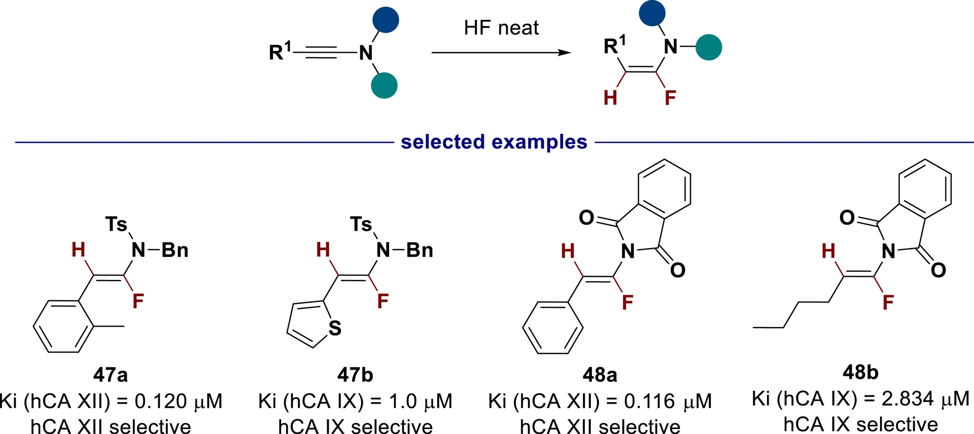 Recently, urea derivatives, and especially sulfonylurea analogs, were found to be good inhibitors of hCA IX/XII [148, 149, 150]. Exploiting our method to design new fluoroenesulfonamides as N-sulfonylurea isosters [87], these compounds, which are stable in solution, were evaluated as CA inhibitors (Scheme 32) [151]. This study identified a novel, highly selective family of cancer-related transmembrane CAIs. The studied α-fluoroenamide ureidoisosters did not inhibit broadly distributed cytosolic isoforms hCA I and II, but preferentially inhibited transmembrane cancer-related isoforms hCA IX and XII. Modifying the C-substituent of α-fluoroenesulfonamide 47 and α-fluoroenimide 48 resulted in selective hCA IX, selective hCA XII, or dual hCA IX and hCA XII isoforms, demonstrating the potential of these novel pharmacophores.