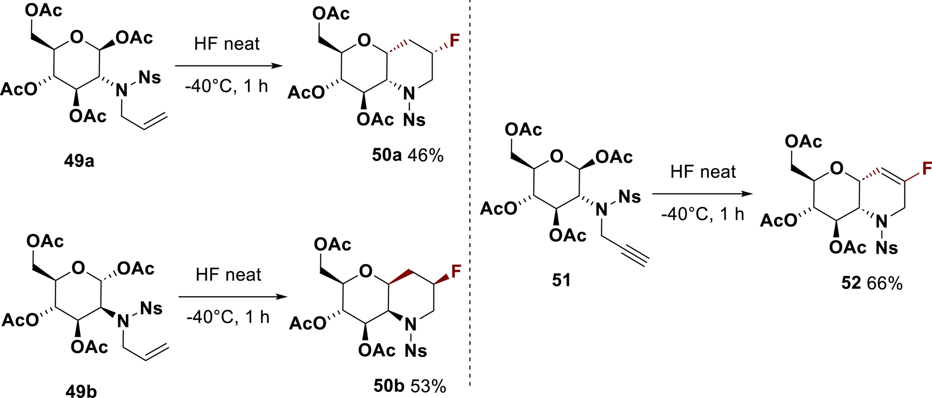 The generation of glycosyl cations from carbohydrates in superacid was then used for synthetic purposes in the 2-aminoglycoside series resulting in unprecedented sugar–azacycle hybrids. A tandem internal C-glycosylation/fluorination reaction initiated by 2-N-allyl- and 2-N-propargyl-glycopyranoses through the intermediacy of ammonium–carbenium superelectrophiles afforded new fluorinated compounds (Scheme 33) [153]. The reaction of N-allyl-D-gluco- 49a and D-mannopyranose 49b provided the corresponding monofluorinated bicycles 50a (46%) and 50b (53%) with a 1,2-cis relationship. Fluoride anion trapping of the transitory cyclic cation led diastereoselectively to the formation of a C–F bond in β-position to the nitrogen atom. A similar process involving alkyne derivative 51 enabled direct synthesis of analog 52 incorporating a vinyl fluoride moiety. These sugar-based polycyclic compounds with a central piperidine ring, amenable to further structural modification, are of interest in a medicinal chemistry context [154], owing to the therapeutic potential offered by both fluorine-containing molecules and sugar derivatives.