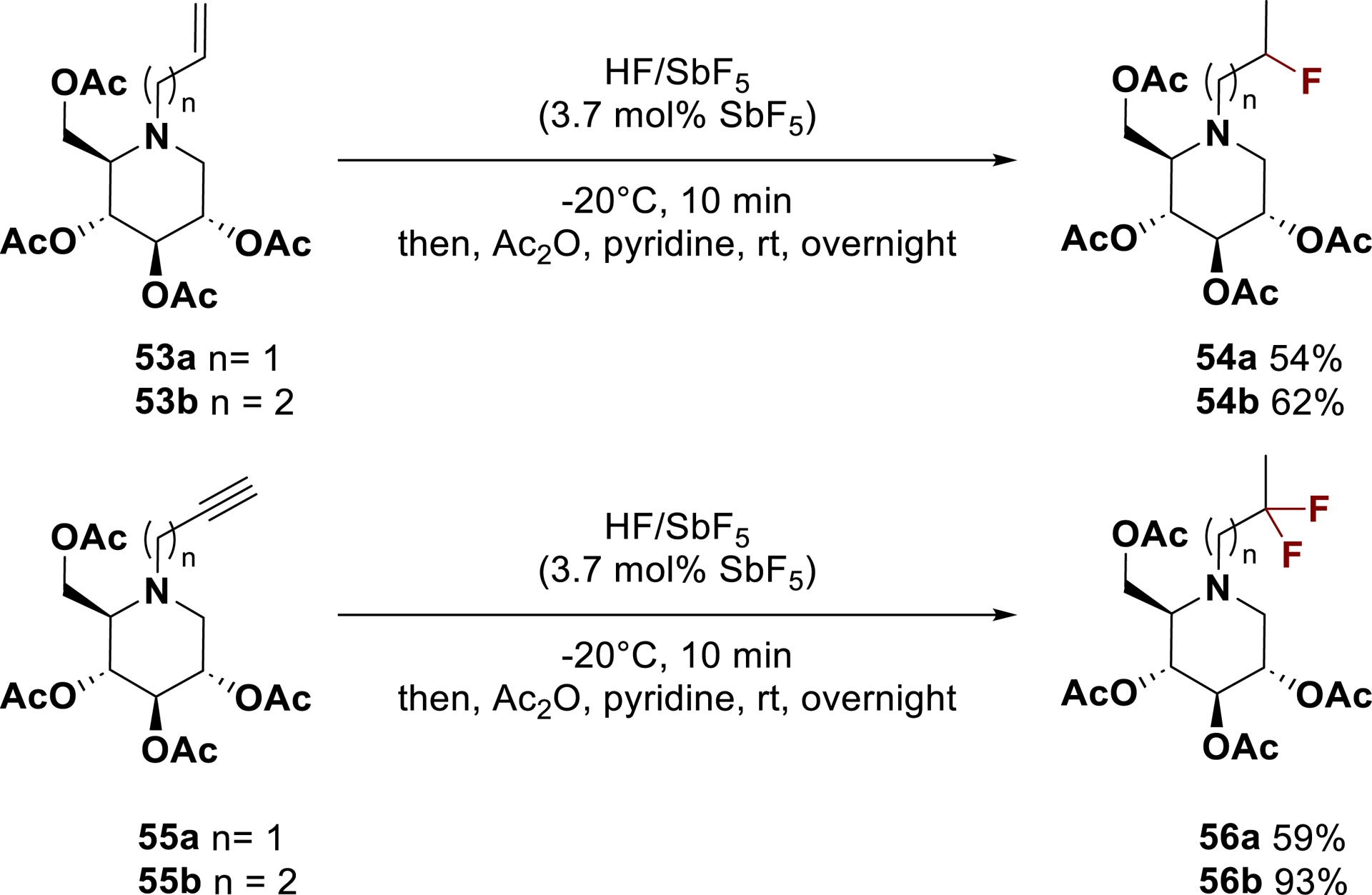 In this context, the introduction of a fluorinated chain on the iminosugar moiety through superacid activation was explored. A small series of fluorinated DNJ derivatives 54 and 56 were successfully synthetized from N-allyl and N-propargyl iminosugars 53 and 55 with good yields, showing the potential of this strategy to generate potentially interesting pharmacophores in this context (Scheme 34) [159].
