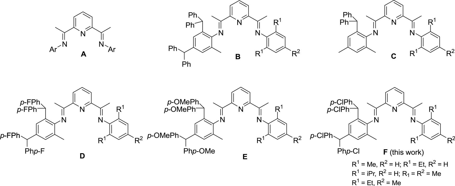 In recent years, our group has been interested in designing new bis(arylimino)pyridyl–iron and –cobalt catalysts by systematically varying the types of N-aryl groups [47, 48, 49, 50]. Of note, unsymmetrical examples incorporating bulky benzhydryl substitution have emerged including 2,4-dibenzhydryl-6-methylphenyl (B, Chart 1) [47], 2-benzhydryl-4,6-dimethylphenyl (C, Chart 1) [48], 2,4-bis(bis(4-fluorophenyl)methyl)-6-methylphenyl (D, Chart 1) [49] and 2,4-bis(bis(4-methoxyphenyl)methyl)-6-methylphenyl (E, Chart 1) [50]. A notable outcome of these studies is that the ortho-benzhydryl substituent can provide protection to the active center and improve thermal stability of the catalyst. Furthermore, the electronic variations made to the periphery of the benzhydryl group (viz., para-X = H, F, OMe) can further influence this stability and also affect catalytic activity and various polymer properties.