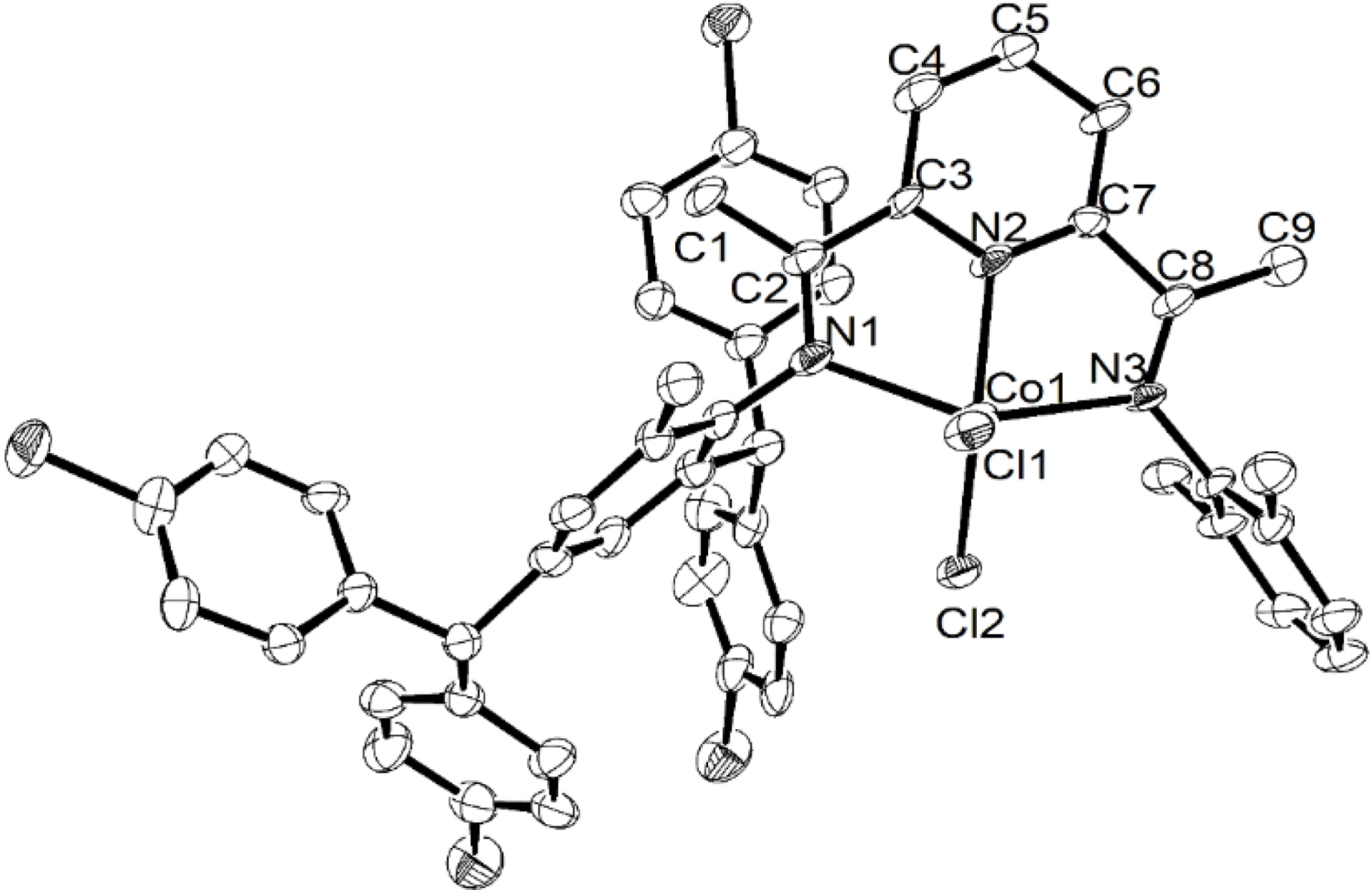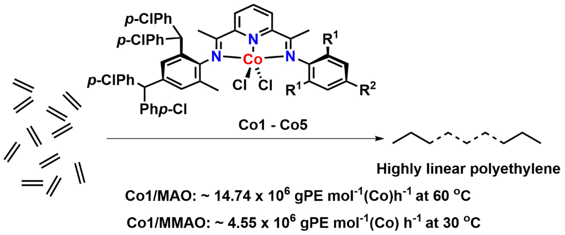 In summary, five examples of unsymmetrical 2,6-bis(arylimino)pyridine-cobalt complexes (Co1–Co5), incorporating one N-2,4-bis(di(4-chlorophenyl)methyl)-6-methylphenyl group and one variable N-aryl group, have been successfully synthesized from their corresponding free N′,N,N′′-ligands. All complexes were formed in high yield and fully characterized including by single crystal XRD for Co1 and Co2. Under activation with MAO and MMAO, Co1–Co5 all demonstrated their ability to promote ethylene polymerization with high activities reaching up to 14.74 × 106 (g of PE)⋅(mol of Co)−1⋅h−1 for Co1/MAO. Moreover, they could deliver this at an appreciable operating temperature of 60 °C, which is notably higher than that seen in previously reported related examples. Furthermore, the polymerizations are well controlled as is evidenced by narrow molecular-weight distributions. Comparison with a series of structurally related benzhydryl-containing cobalt catalysts highlights the important role of the para-chloride group. Overall, this is a rare example of a cobalt-based catalyst system that possesses the combined properties of high thermal stability and high activity producing highly linear polyethylene. This also represents an excellent demonstration of the capacity of rational ligand design to improve the performance of ethylene polymerization catalysts.