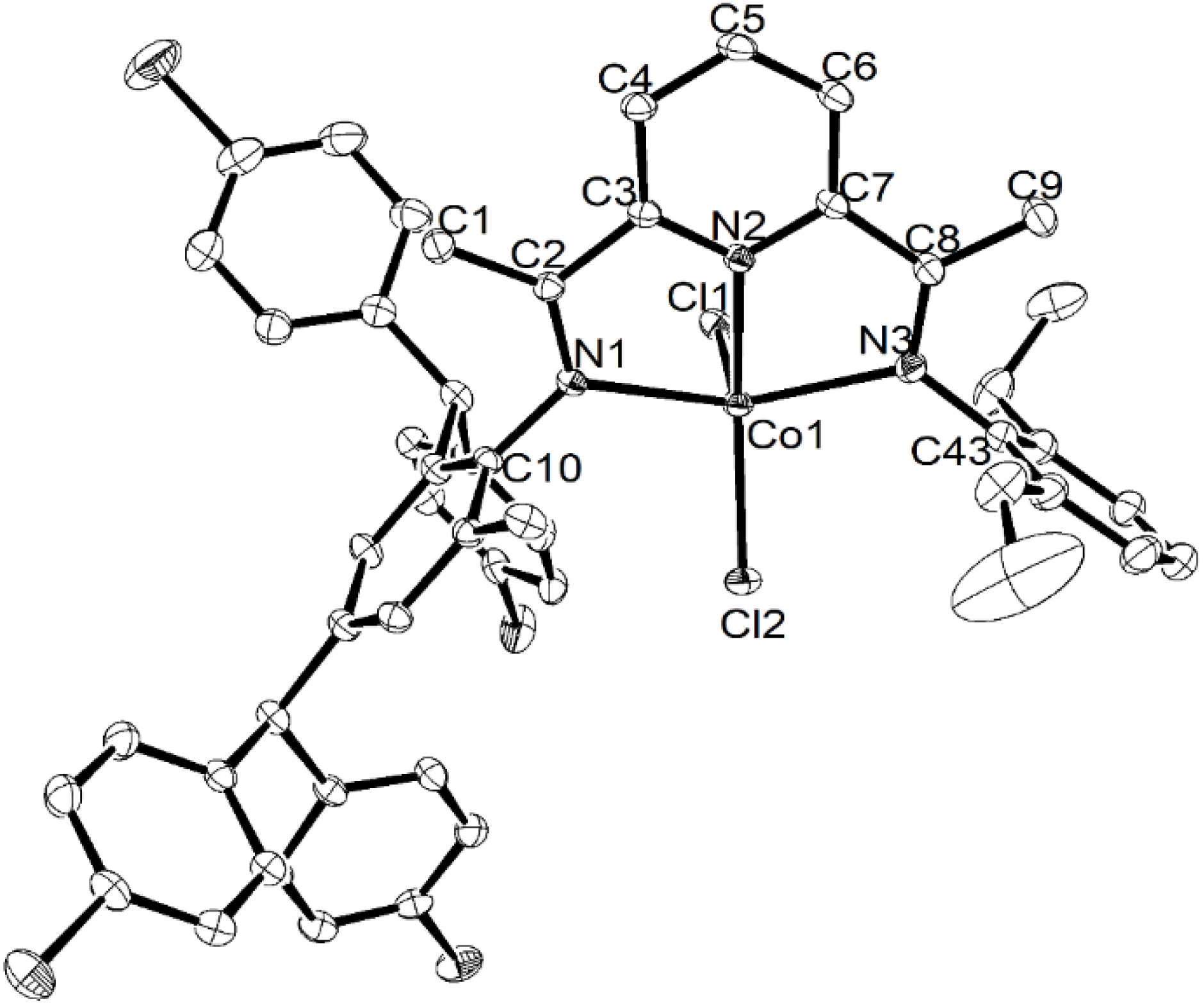 In each case, the coordination geometry of the cobalt center can be best described as distorted square pyramidal, with the basal plane defined by N1, N2, N3 and Cl2. The Co1 center sits above the basal plane by 0.571 Å in Co1 and 0.486 Å in Co2, while axial Cl1 further protrudes by 2.853 Å in Co1 and 2.735 Å in Co2. With regard to the Co–N distances, the central Co–Npyridine bond length [2.051(8) (Co1), 2.050(3) (Co2) Å] is markedly shorter than the exterior Co–Nimine ones [2.195(9)–2.265(9) Å], which likely derives from the good donor properties of the central pyridine and the constraints of this N′,N,N′′-ligand class; similar observations have been previously noted [51]. The presence of inequivalent N-aryl groups causes some more modest variations in the exterior Co–Nimine distances, which is also affected by the steric properties exerted by the N-2,6-dimethylphenyl (Co1) and N-2,6-diethylphenyl (Co2) groups. In terms of the Co–Cl bond lengths, some variation is also seen with that involving the axial chloride (Co–Cl1: 2.304(3) Å (Co1), 2.3070(10) Å (Co2)) longer than its basal counterpart (Co1–Cl2: 2.249(3) Å (Co1), 2.2464(9) Å (Co2)). The N-aryl rings are positioned almost perpendicular with respect to the N1–N2–N3–Co1 coordination plane with dihedral angles of 81.61° and 77.03° for Co1 and 88.74° and 82.63° for Co2 [52]. There are no intermolecular contacts of note in either structure.