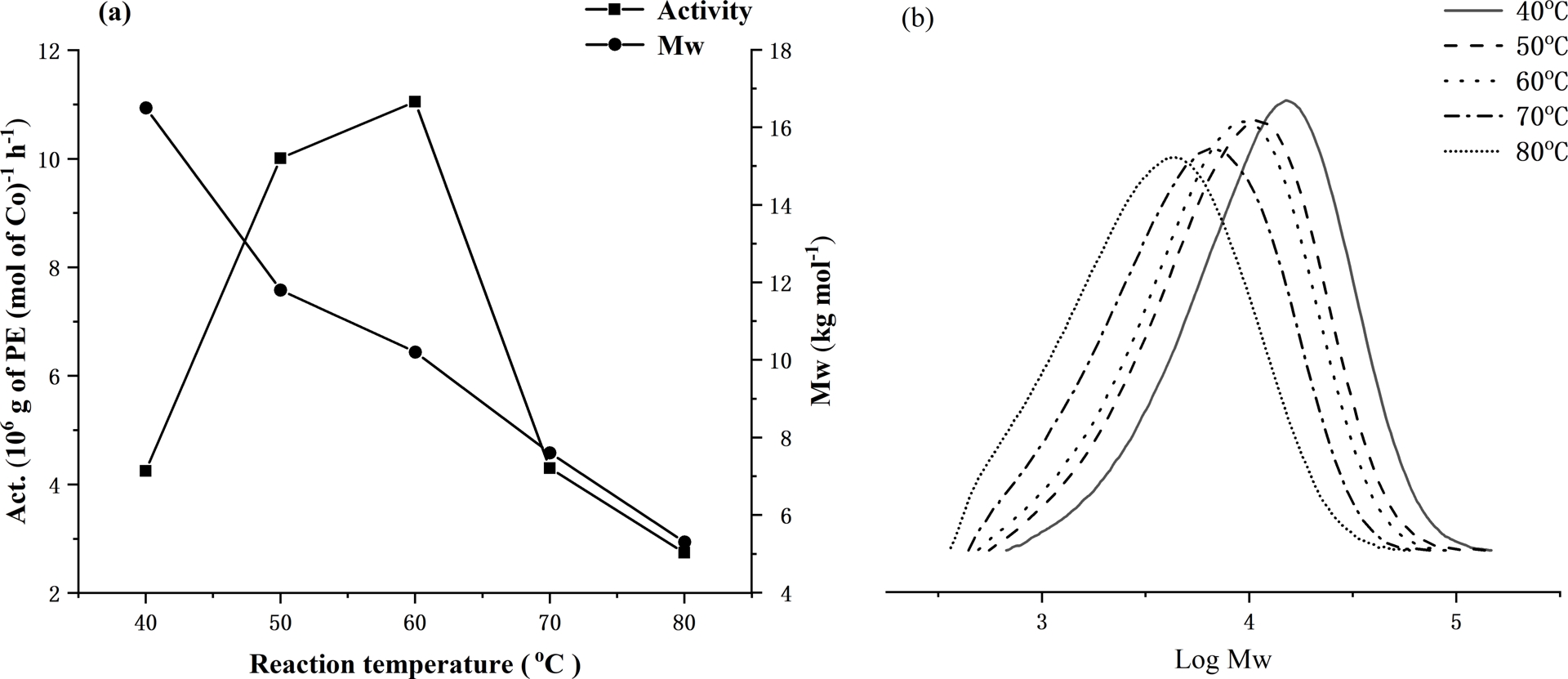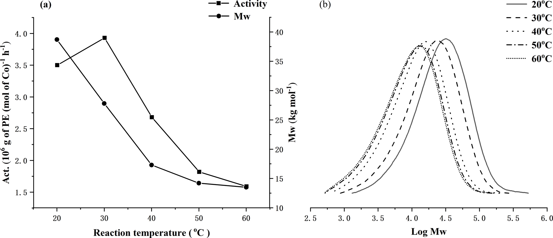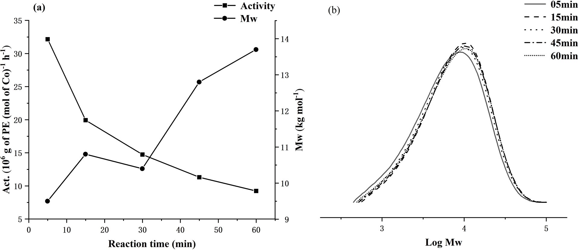 The influence of reaction time on the polymerization behavior of Co1/MAO and the lifetime of the active species was then investigated with the reaction temperature fixed at 60 °C and the Al:Co molar ratio at 2000. Specifically, the tests were run over 5, 15, 30, 45, and 60 min (entries 7 and 10–13, Table 2) and revealed the maximum activity of 32.16 × 106 (g of PE)⋅(mol of Co)−1⋅h−1 to be detected within 5 min (entries 10, Table 2). After this initial spike in activity, the level slowly decreased to only 9.24 × 106 (g of PE)⋅(mol of Co)−1⋅h−1 after 1 h (entry 13, Table 2), which suggests that Co1/MAO displayed good stability and appreciable lifetime. Evidently, the active species was quickly generated upon addition of MAO and then underwent a steady deactivation over time [60, 61]. As for the polymer molecular weight, this was found to slowly increase over reaction time (Figure 5), which demonstrated that the active species remained potent throughout [62, 63].