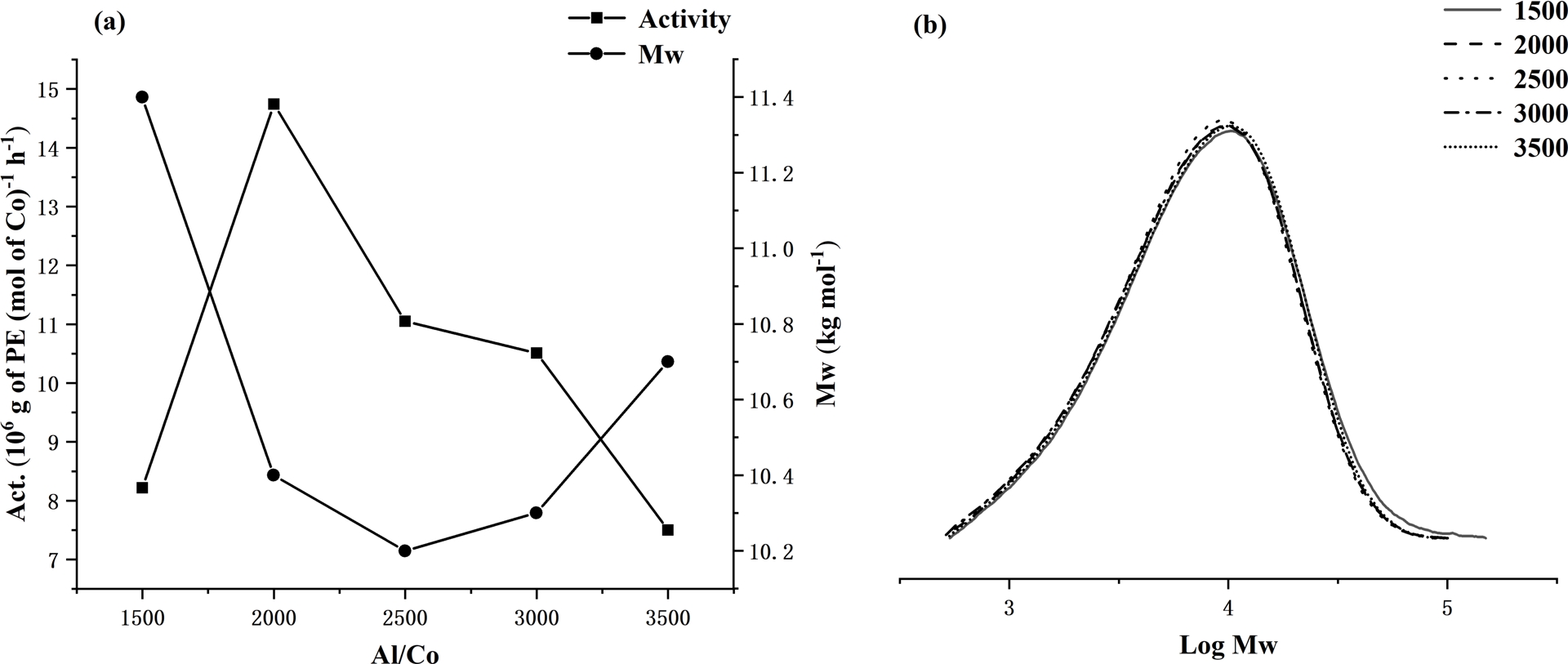 Next, the Al:Co molar ratio using Co1/MMAO was altered with the run temperature maintained at 30 °C (entries 2 and 6–9, Table 3) leading to the highest activity of 4.55 × 106 (g of PE)⋅(mol of Co)−1⋅h−1 being achieved with a ratio of 3000 (entry 7, Table 3). As with Co1/MAO, the catalytic activity gradually declined at higher ratios, while polymer molecular weight remained relatively constant (Mw range: 27.8–31.5 kg mol−1) but with a perceptible decrease especially at higher ratios.