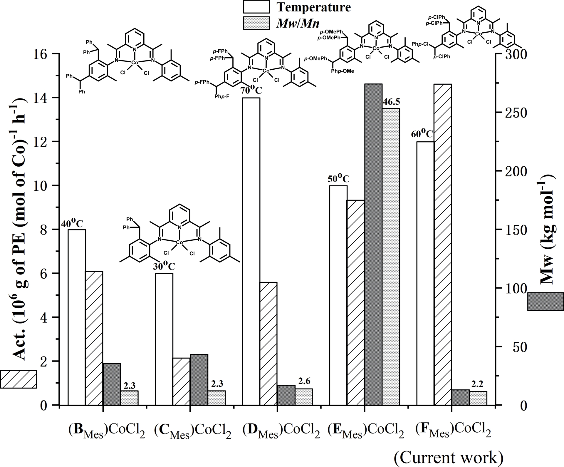 To help contextualize the findings in this work, we have extracted key performance data for mesityl-containing Co4/MAO [(FMes)CoCl2] obtained herein (entry 18, Table 2) and assembled this alongside those previously reported for (BMes)CoCl2, (CMes)CoCl2, (DMes)CoCl2, and (EMes)CoCl2 (Figure 10); all tests were obtained under optimized conditions at PC 2H4 = 10 atm using MAO [47, 48, 49, 50]. All five systems are structurally related with (BMes)CoCl2, (DMes)CoCl2, (EMes)CoCl2, and (FMes)CoCl2 all incorporating N-2-Me-4,6-bis(4,4′-X2dibenzhydryl)phenyl (X = H, F, OMe, Cl) substitution while (CMes)CoCl2, N-2,4-diMe-6-dibenzhydrylphenyl substitution. For the most closely related systems (BMes)CoCl2, (DMes)CoCl2, (EMes)CoCl2, and (FMes)CoCl2, it is evident that chloro-containing (FMes)CoCl2 is the most active (14.6 × 106 (g of PE)⋅(mol of Co)−1⋅h−1; entry 18, Table 2) but forms the lowest molecular weight polymer (Mw = 13.0 kg⋅mol−1; entry 18, Table 2). Conversely, (EMes)CoCl2 bearing an electron donating methoxy-substituent showed moderate activity, but the resulting polyethylene afforded the highest molecular weight (Mw = 274.0 kg⋅mol−1) and broad dispersity [50]. Evidently, these results underline the electronic influence played by the para-groups in the benzhydryl group on catalytic performance. By comparison, (CMes)CoCl2 showed the lowest activity (2.1 × 106 (g of PE)⋅(mol of Co)−1⋅h−1) [48], which could be the result of a combination of both steric and electronic effects. Nevertheless, all these classes of benzhydryl-substituted bis(arylimino)pyridyl–cobalt catalyst impart excellent control as evidenced by the single-site-like behavior (Mw/Mn range: 2.2–2.6).