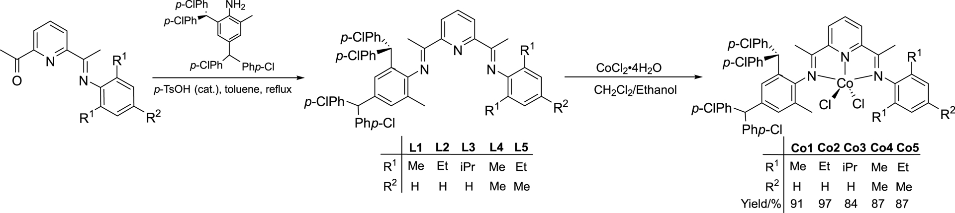 Five different examples of 2-[1-(2,4-bis(di(4-chlorophenyl)methyl)-6-methylphenylimino)ethyl]-6-[1-(arylimino)ethyl]pyridine (aryl = 2,6-dimethylphenyl (L1); 2,6-diethylphenyl (L2); 2,6-diisopropylphenyl (L3); 2,4,6-trimethylphenyl (L4); 2,6-diethyl-4-methylphenyl (L5)) were synthesized by the acid-catalyzed condensation reaction of the corresponding imine-ketone with 2,4-bis(di(4-chlorophenyl)methyl)-6-methylaniline in toluene under reflux; related procedures have been reported elsewhere (Scheme 1) [51]. Compounds L1–L5 were isolated in moderate yield and were characterized by 1H/13C NMR and FT-IR spectroscopy, and purity further confirmed by elemental analysis (see experimental).
