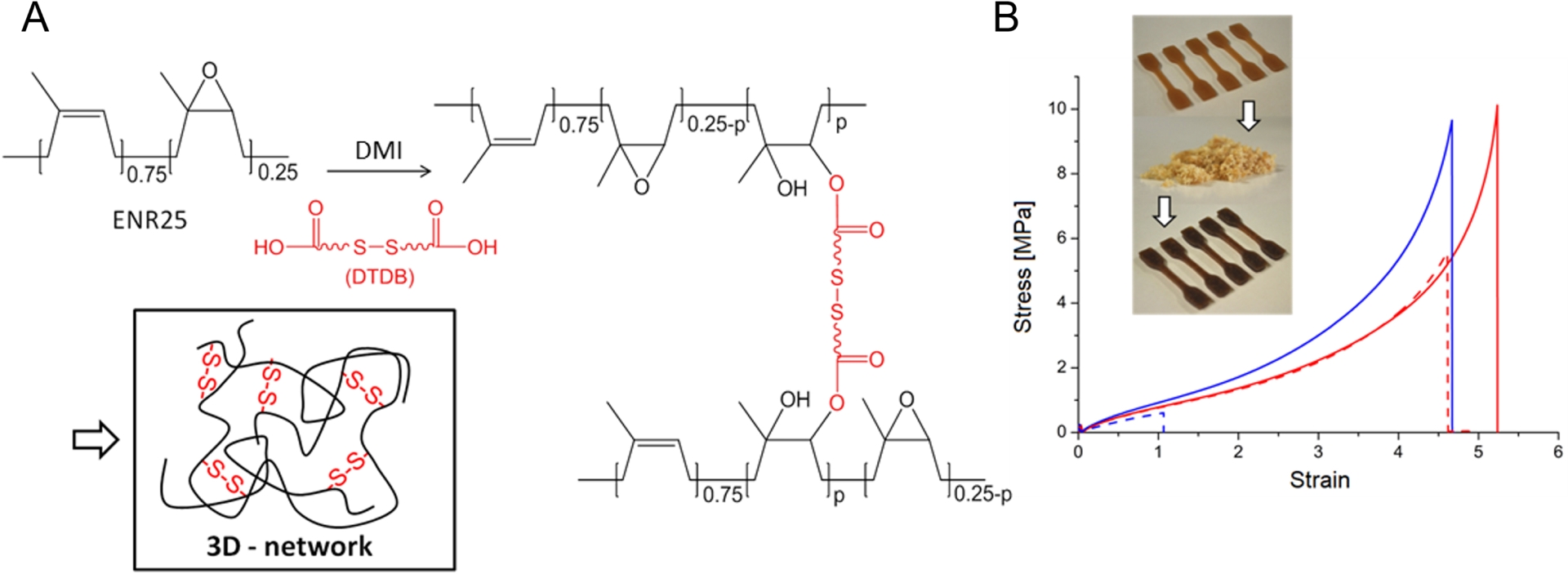 (A) Crosslinking of ENR25 with DTDB/DMI and schematic representation of the disulfide-containing network. (B) Recycling experiment. Tensile tests before (line) and after (dashed) the recycling experiment (red: DTDB-cured; blue: DA-cured). The image illustrates dumbbell-shaped cured rubber sample finely grounded and then reshaped by compression molding (after reference [21]).