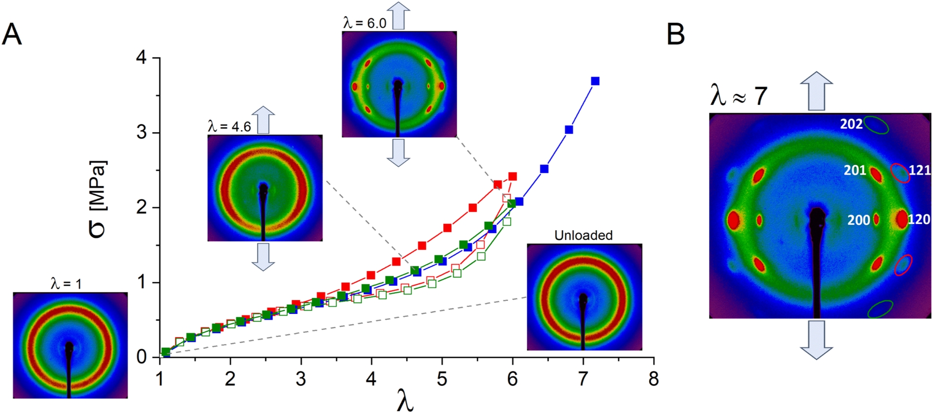 WAXS experiments in DA-ENR25 (p = 50) over three traction cycles (red: first cycle; green: second cycle; blue: third cycle extended to rupture). (A) Patterns observed during the second loading and unloading phases, with the traction direction oriented vertically. Strain rate: 1.25 min−1. (B) Close-up of the pattern at 𝜆 ≈ 7, highlighting the anisotropic amorphous halo of extended ENR chains and peak assignment of the SIC crystals within an orthorhombic lattice.
